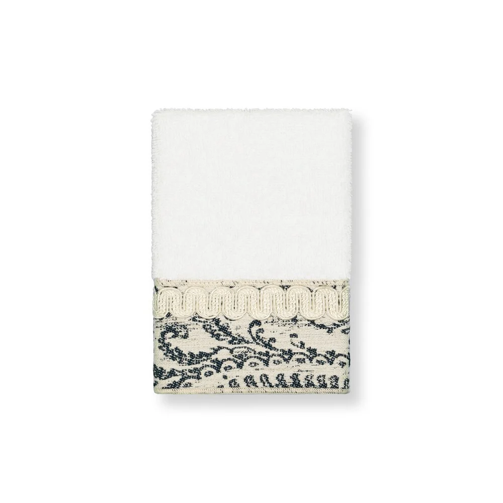 This authentic hotel and spa washcloths are made from plush, high end Turkish cotton for supreme absorbency and durability. These beautiful white washcloths are embellished with a navy blue and ivory paisley jacquard woven patterned border accented by an ivory woven textured gimp trim to add that special touch to your bathroom.