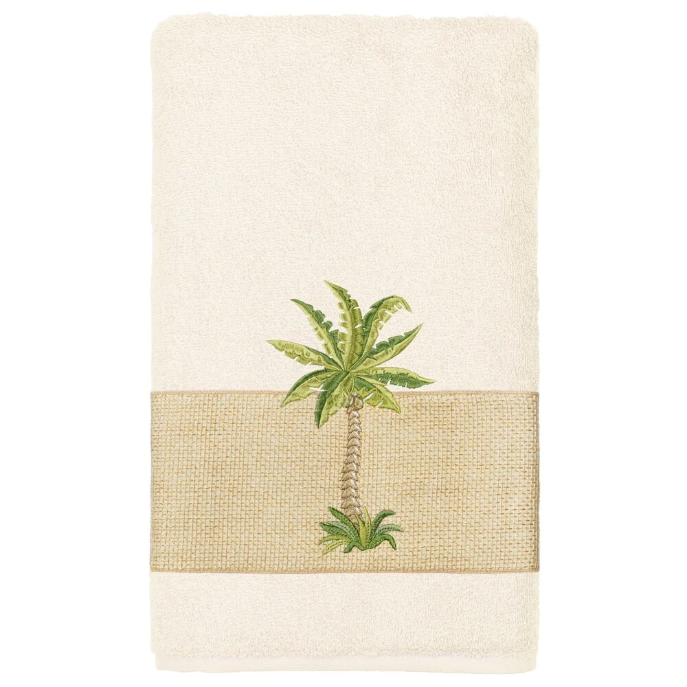 This authentic hotel and spa 4-piece towel set is made from plush, high end Turkish cotton for supreme absorbency and durability. The beautiful cream towels are embellished with a palm tree applique and embroidery design with a textured woven border to add that special touch to your bathroom.