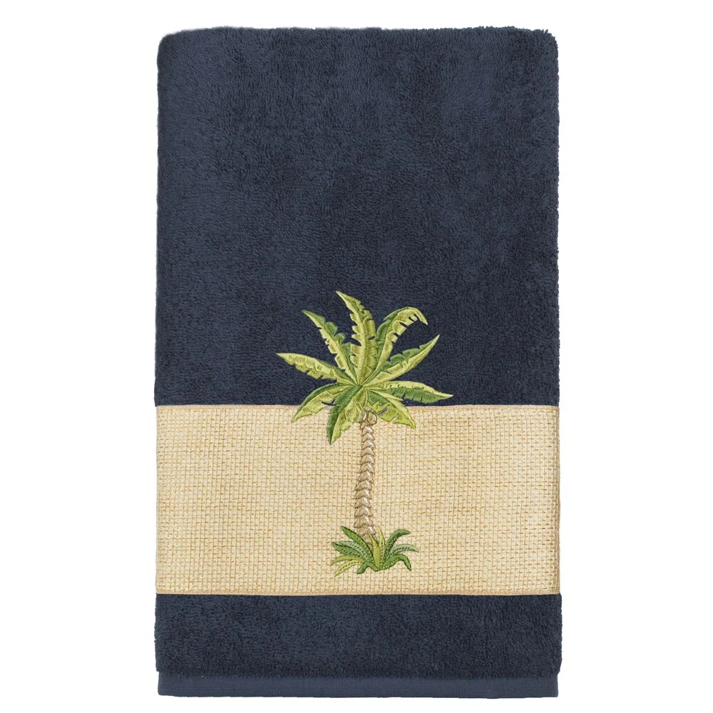 This authentic hotel and spa 4-piece towel set is made from plush, high end Turkish cotton for supreme absorbency and durability. The beautiful midnight blue towels are embellished with a palm tree applique and embroidery design with a textured woven border to add that special touch to your bathroom.