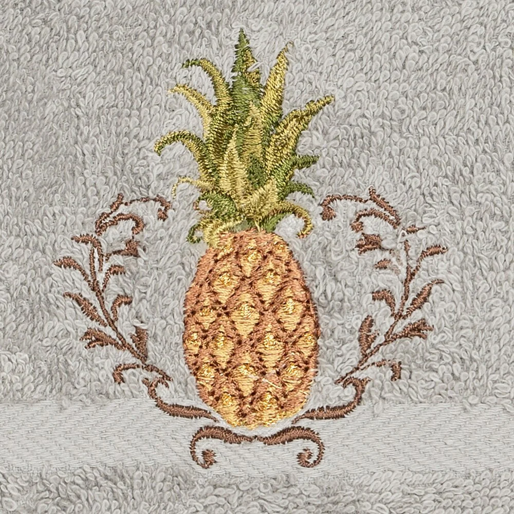 This authentic hotel and spa set of 2 washcloths are made from plush, high end Turkish cotton for supreme absorbency and durability. These beautiful light grey washcloths are embellished with an embroidered pineapple design which traditionally symbolizes welcome and hospitality to add that special touch to your bathroom.