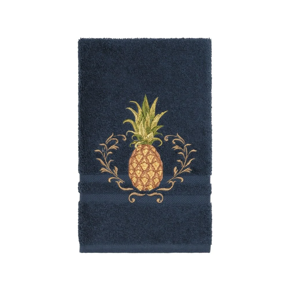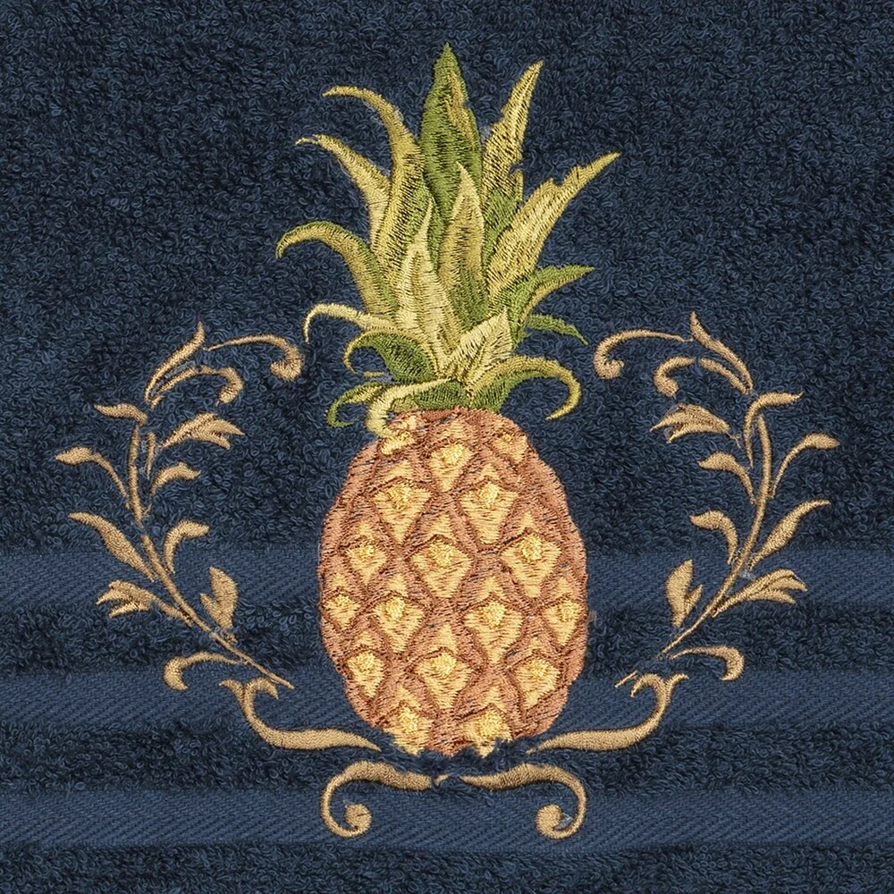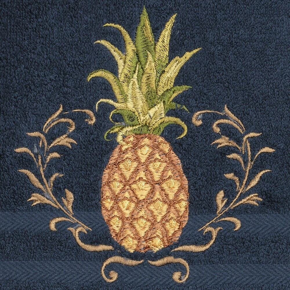 This authentic hotel and spa 8-piece towel set is made from plush, high end Turkish cotton for supreme absorbency and durability. The beautiful midnight blue towels are embellished with an embroidered pineapple design which traditionally symbolizes welcome and hospitality to add that special touch to your bathroom.