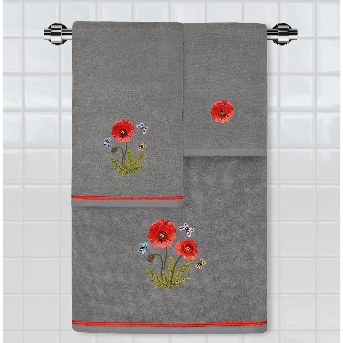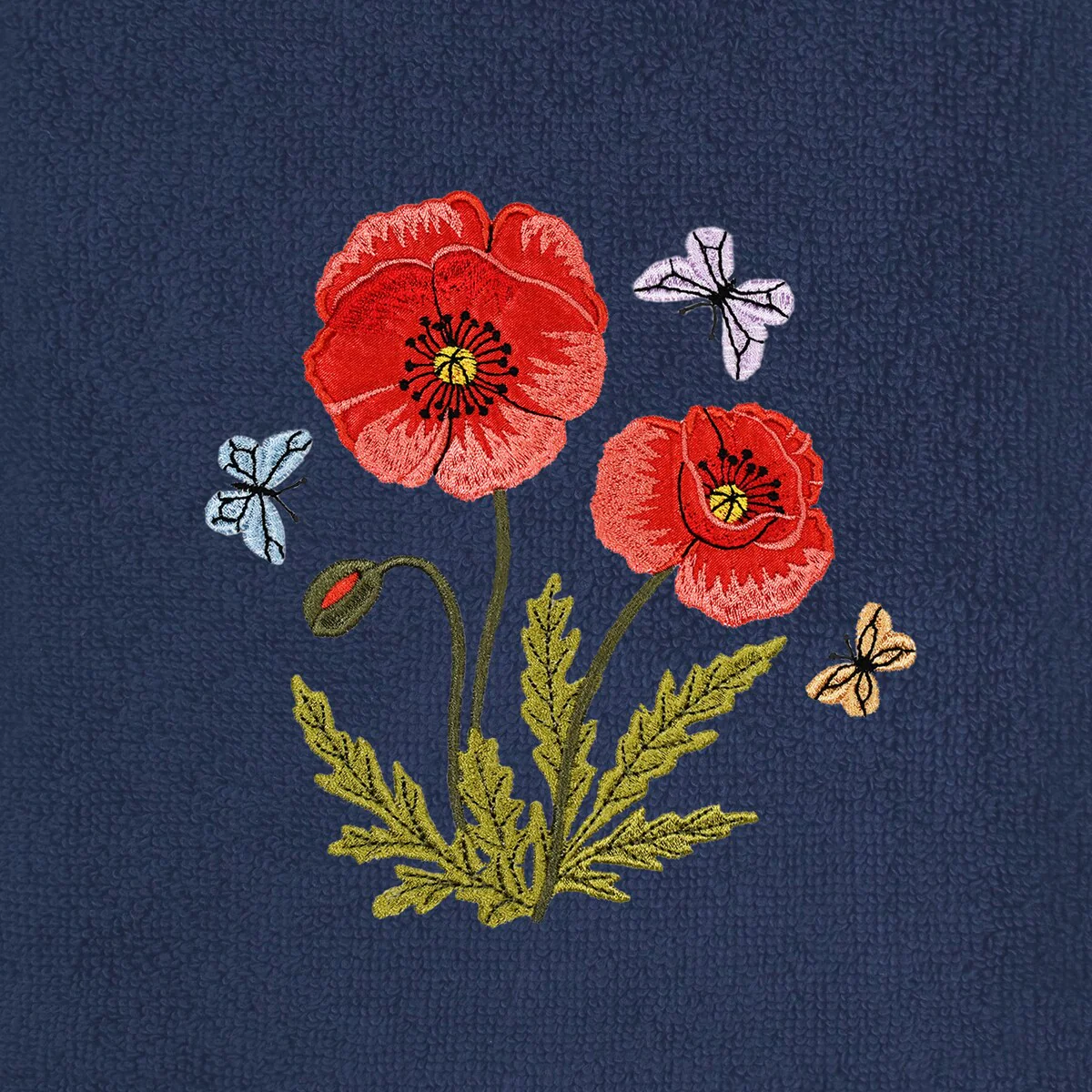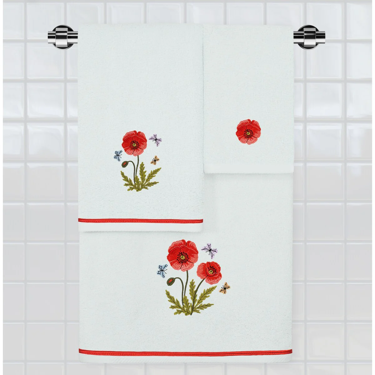 Create a mood of cottage charm in your bath with the POLLY Embellished Towel Collection. These towels feature an applique embroidered bouquet of vibrant poppies and foliage, highlighted by floating butterflies. Cloud soft and super absorbent, these luxurious, durable towels keep their plush appearance after washing. This collection is available in 8 elegant colors: White, Beige, Blush, Aqua, Silver, Cocoa, Charcoal and Marine. The POLLY Towel Collection brings a natural spirit and richness to your home decor and makes a great gift!Note: Due to variations in computer screen resolutions, slight color differences may exist between images provided and actual product.