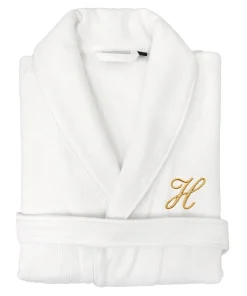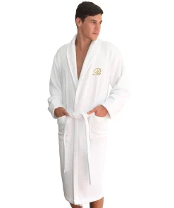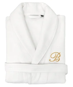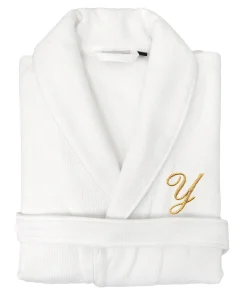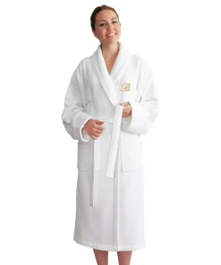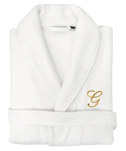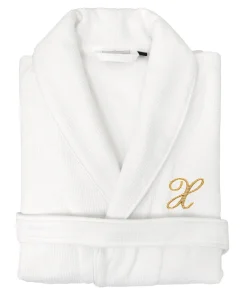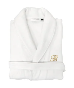 This luxuriously soft cotton waffle and terry robe is a perfect combination of small scale waffle weave outside and light terry looped inside and features an embroidered gold intial of your choice. This medium weight unisex cotton bath robe wraps you in the comfort of a thirsty towel without the weight of the heavier robes.