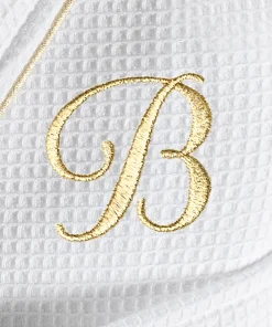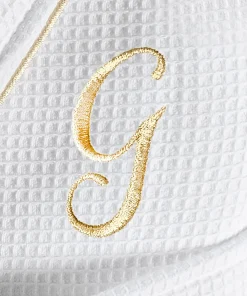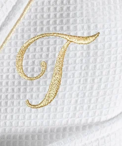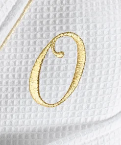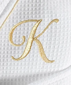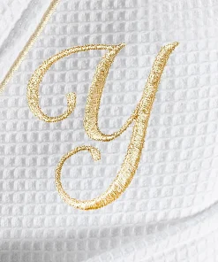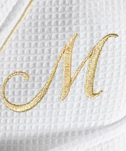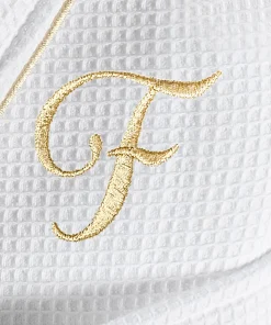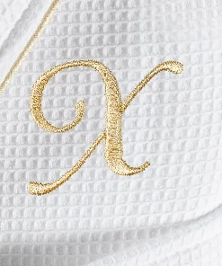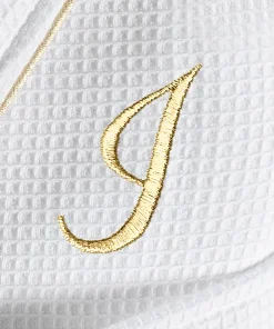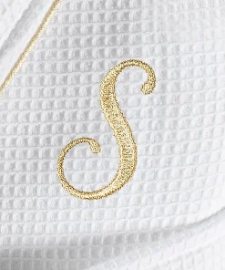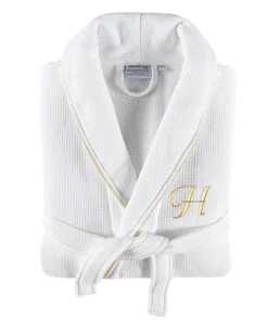 •  White Waffle Terry Bathrobe with gold satin piping