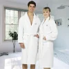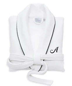 This white robe is woven from soft, 100-percent genuine Turkish cotton in a waffle design on the outside with ultra-absorbent terry on the inside. Smartly styled with a black satin trim on the collar, cuffs and pockets, this sophisticated robe will keep you immensely dry and exceptionally comfortable. Features two large front pockets, a removable belt and a black embroidered initial of your choice.