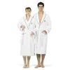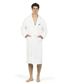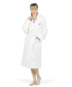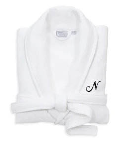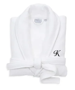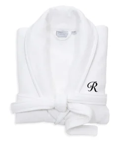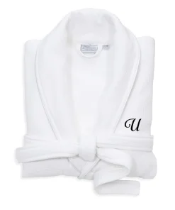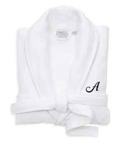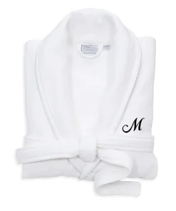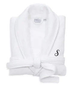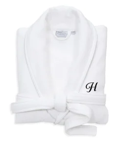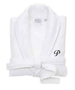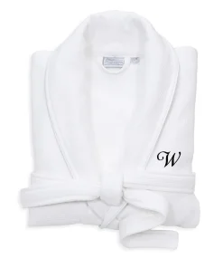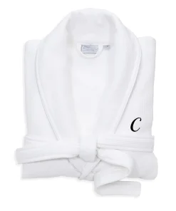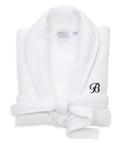 This white robe is woven from soft, 100-percent genuine Turkish cotton in a waffle design on the outside with ultra-absorbent terry on the inside. Smartly styled with a white satin trim on the collar, cuffs and pockets, this sophisticated robe will keep you immensely dry and exceptionally comfortable. Features two large front pockets, a removable belt and a black embroidered initial of your choice.