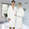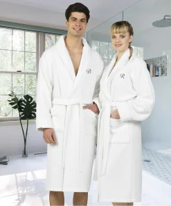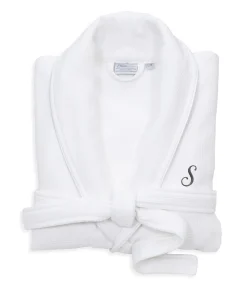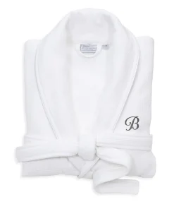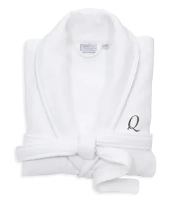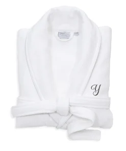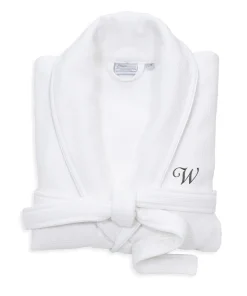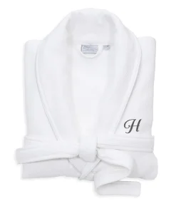 This white robe is woven from soft, 100-percent genuine Turkish cotton in a waffle design on the outside with ultra-absorbent terry on the inside. Smartly styled with a white satin trim on the collar, cuffs and pockets, this sophisticated robe will keep you immensely dry and exceptionally comfortable. Features two large front pockets, a removable belt and a dark grey embroidered initial of your choice.