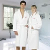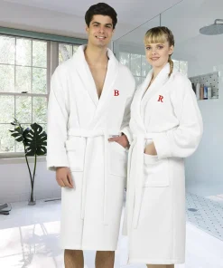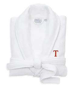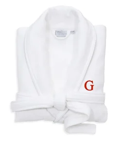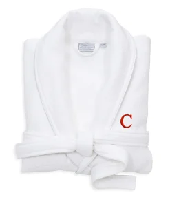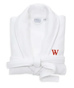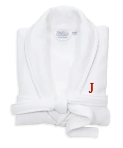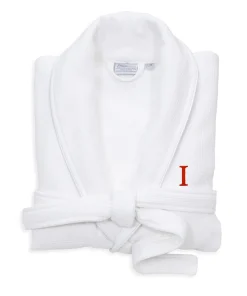 This white robe is woven from soft, 100-percent genuine Turkish cotton in a waffle design on the outside with ultra-absorbent terry on the inside. Smartly styled with a white satin trim on the collar, cuffs and pockets, this sophisticated robe will keep you immensely dry and exceptionally comfortable. Features two large front pockets, a removable belt and a red embroidered initial of your choice.