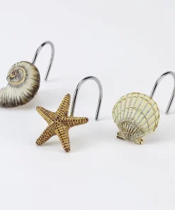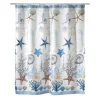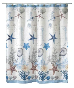 The Avanti Antigua 13-Piece Shower Curtain/Hook Set features a printed shower curtain with sea creatures and coastal icons with sequins. The hooks are hand-painted with nautilus shells, fan shells and starfish. Includes 72" x 72" 100% polyester shower curtain and 12 resin shower hooks.