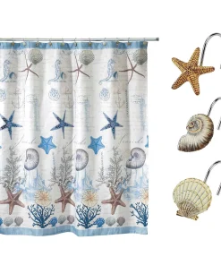 The Avanti Antigua 13-Piece Shower Curtain/Hook Set features a printed shower curtain with sea creatures and coastal icons with sequins. The hooks are hand-painted with nautilus shells, fan shells and starfish. Includes 72" x 72" 100% polyester shower curtain and 12 resin shower hooks.