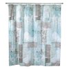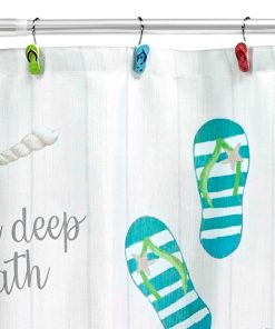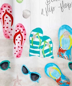 The Avanti Beach Mode Collection Shower Curtain is decorated with beach sayings, flip-flops in blue, green and pink and sunglasses. The background is a white shiplap design with a sand base at the bottom. Printed on 100% polyester, 72 x 72 in. and coordinating pieces available.
