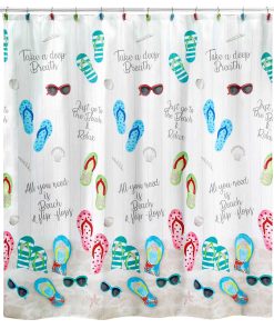 The Avanti Beach Mode Collection Shower Curtain is decorated with beach sayings, flip-flops in blue, green and pink and sunglasses. The background is a white shiplap design with a sand base at the bottom. Printed on 100% polyester, 72 x 72 in. and coordinating pieces available.