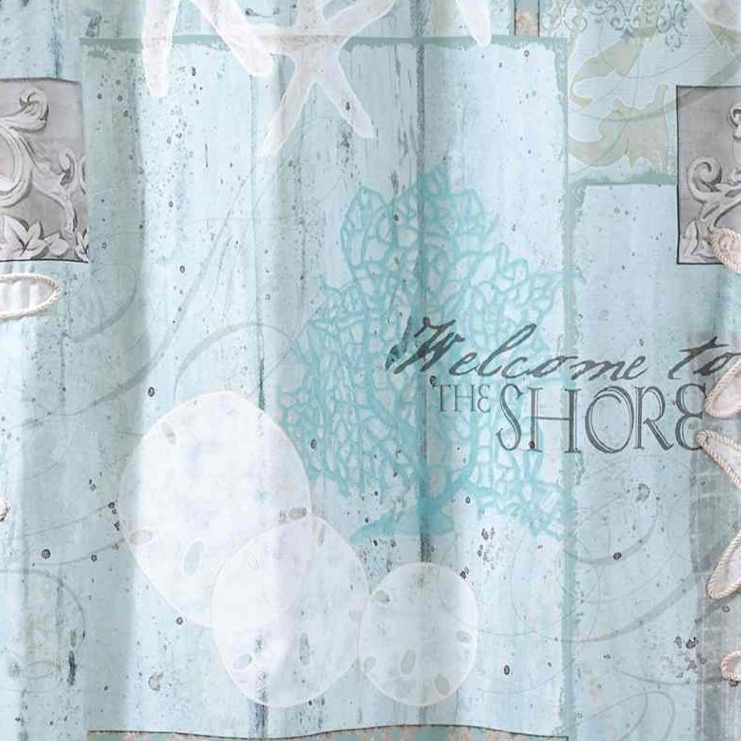The Avanti Beachcomber Shower Curtain features a beautifully printed seascape with starfish, coral and sand dollars in shades of mauve, ivory, white, aqua and teal on a shiplap background. 72" x 72", 100% polyester. Coordinating accessories, towels and rug available.