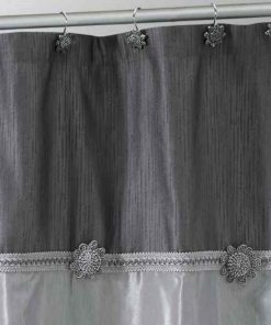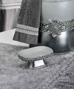The Avanti Braided Medallion Granite Decorative Bathroom Rug features a medium grey center with dark grey striped borders on either side separated by a faux braid edging. Tufted of 100% cotton, 20" x 30", non-skid latex back. Coordinating accessories, shower curtains and towels available.