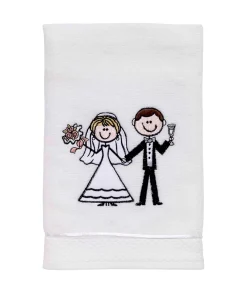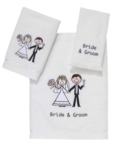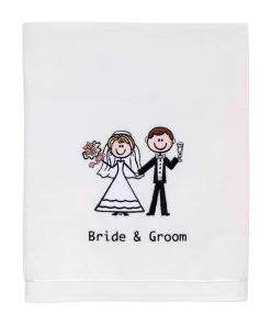 The Avanti Bride & Groom 3-Pc. Decorative Embellished Towel Set features a whimsically embroidered happy couple as they celebrate their big day. Towel is 100% cotton white velour with satin piping on the bath and hand. Includes 1 ea of bath (27" x 50"), hand (16" x 30"), fingertip (11" x 18").