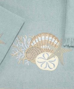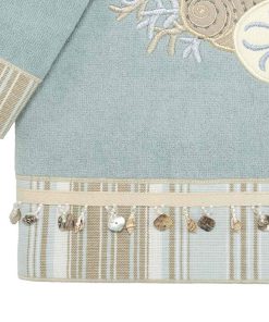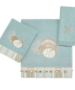 The Avanti By the Sea Mineral 3-Pc. Decorative Towel Set is embroidered with shells, starfish and coral in blues and beiges. Bath and hand are finished with a blue and white stripe cotton fabric trim with shells on the bath. 100% cotton mineral velour towel. Includes 1 ea of bath, hand, fingertip.