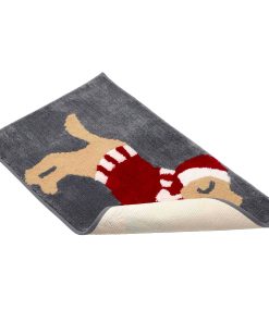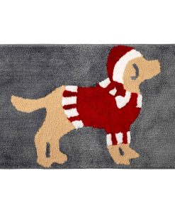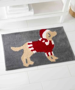 The Avanti Christmas Dog Holiday Bath Rug features a yellow lab silhouetted against a dark grey background. The dog is smartly outfitted in a red sweater with white accents and a Santa hat. Tufted of 100% polyester for colorfastness and quick-drying, 20" x 32" with rubber non-skid back.
