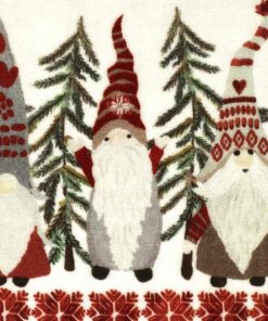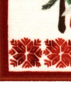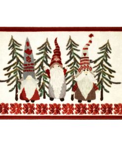 The Avanti Christmas Gnomes Rug features 3 festively attired gnomes with pine trees on a white ground. The bottom is bordered with the red and white snowflake motif and a red frame surrounds the entire rug. 20" x 30", printed on 100% polyester, non-skid latex back.