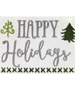 The Avanti Christmas Trees Decorative Bathroom Rug features "Happy Holidays" tufted in grey with 2 whimsical green pine trees on a white ground. The bottom is bordered with a row of spruce green "X’s" . 20" x 30", 100% polyester for soft feel, absorbency and color-fastness.