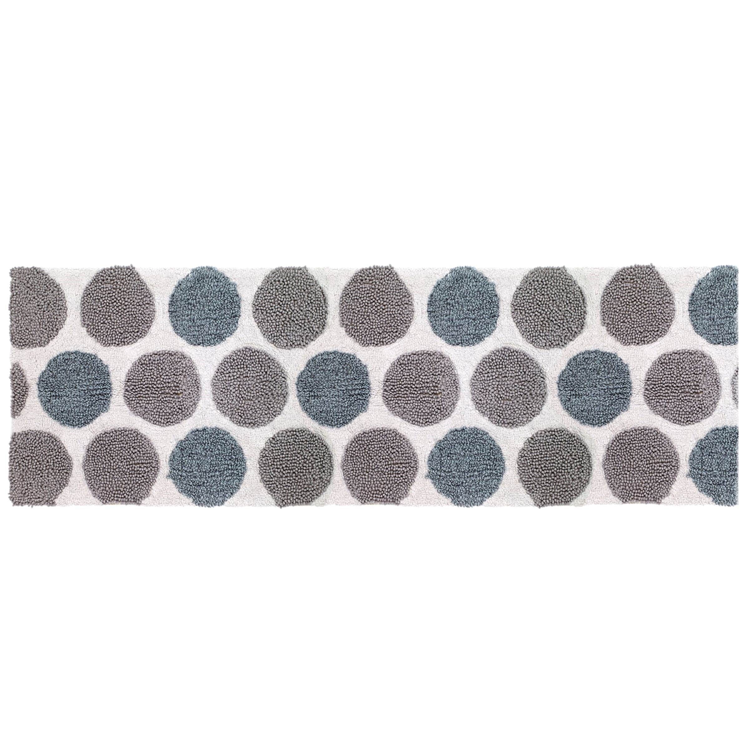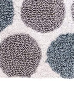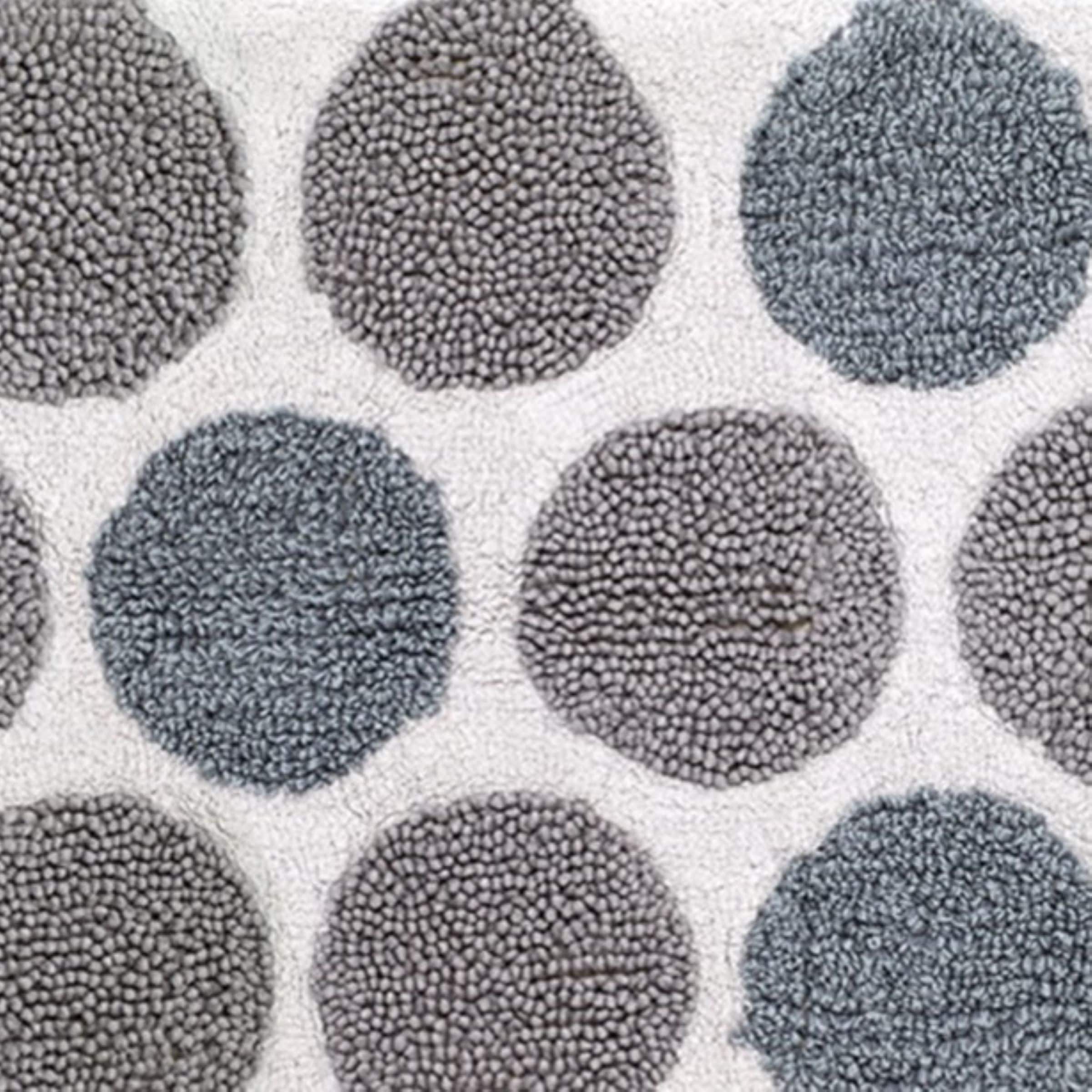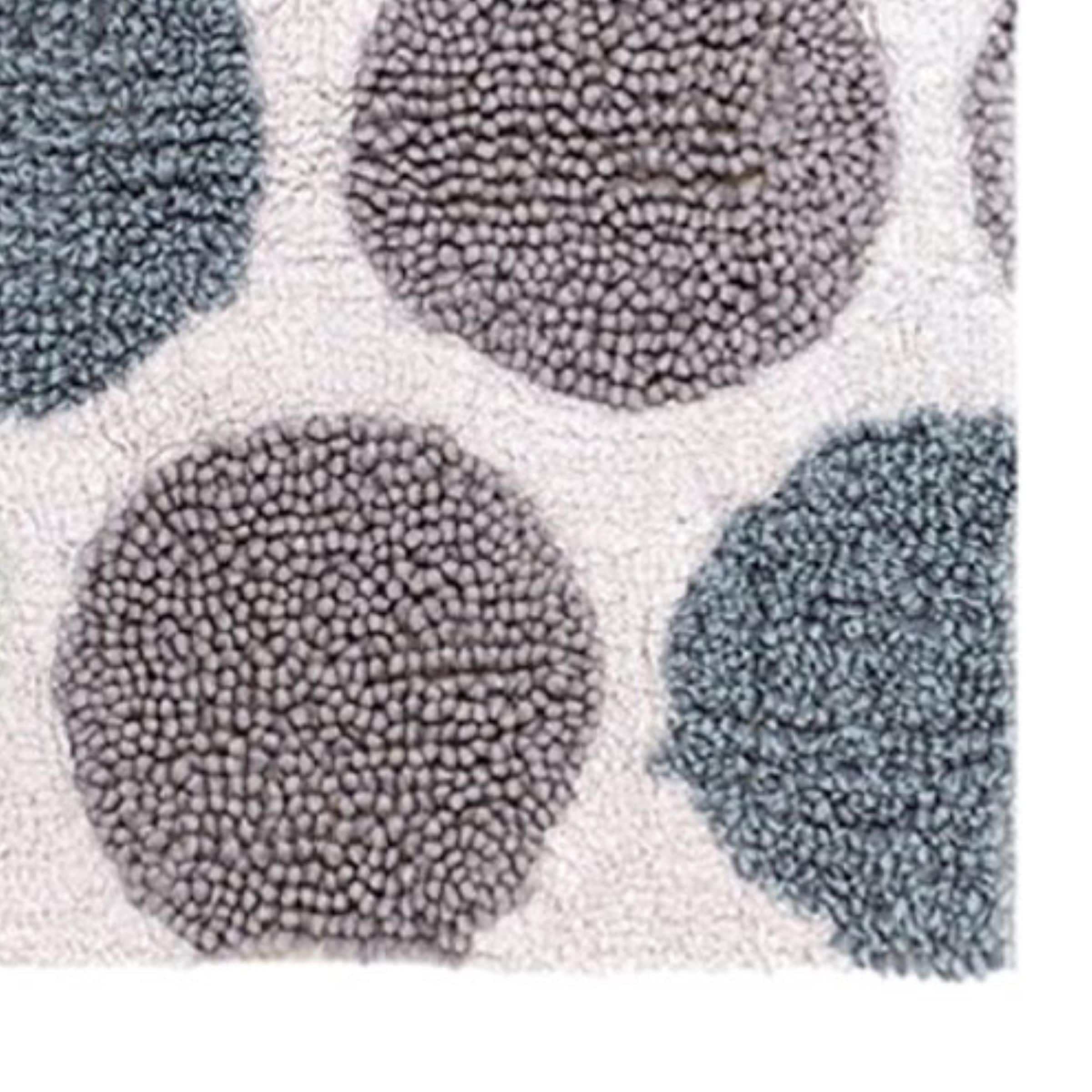 The Avanti Dotted Circles 24" x 60" Double-Vanity Decorative Bathroom Rug is tufted in 100% cotton with large blue and grey chenille circles with lurex on a white ground. Non-skid latex back. Coordinating shower curtain, bath accessories and towels available.