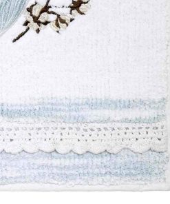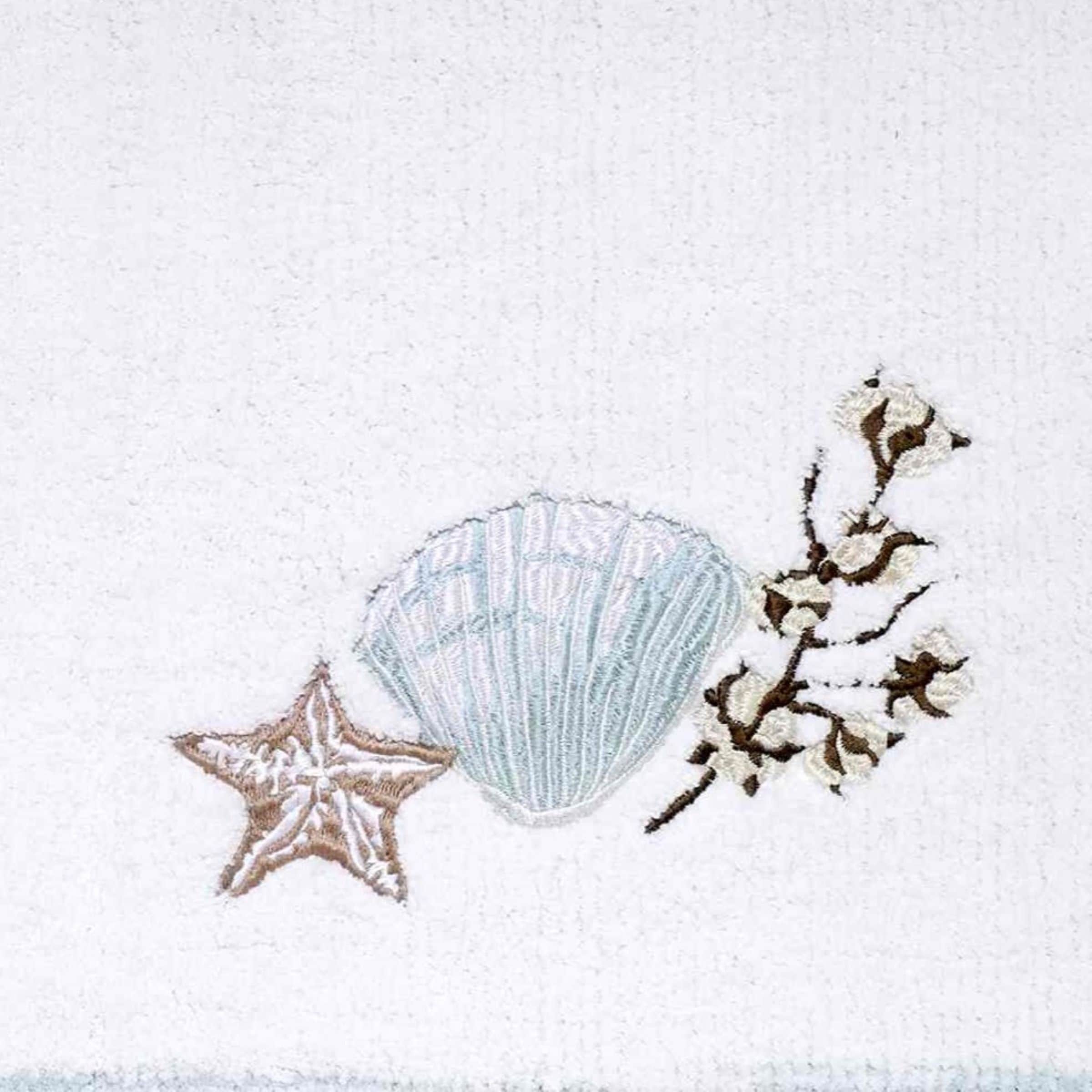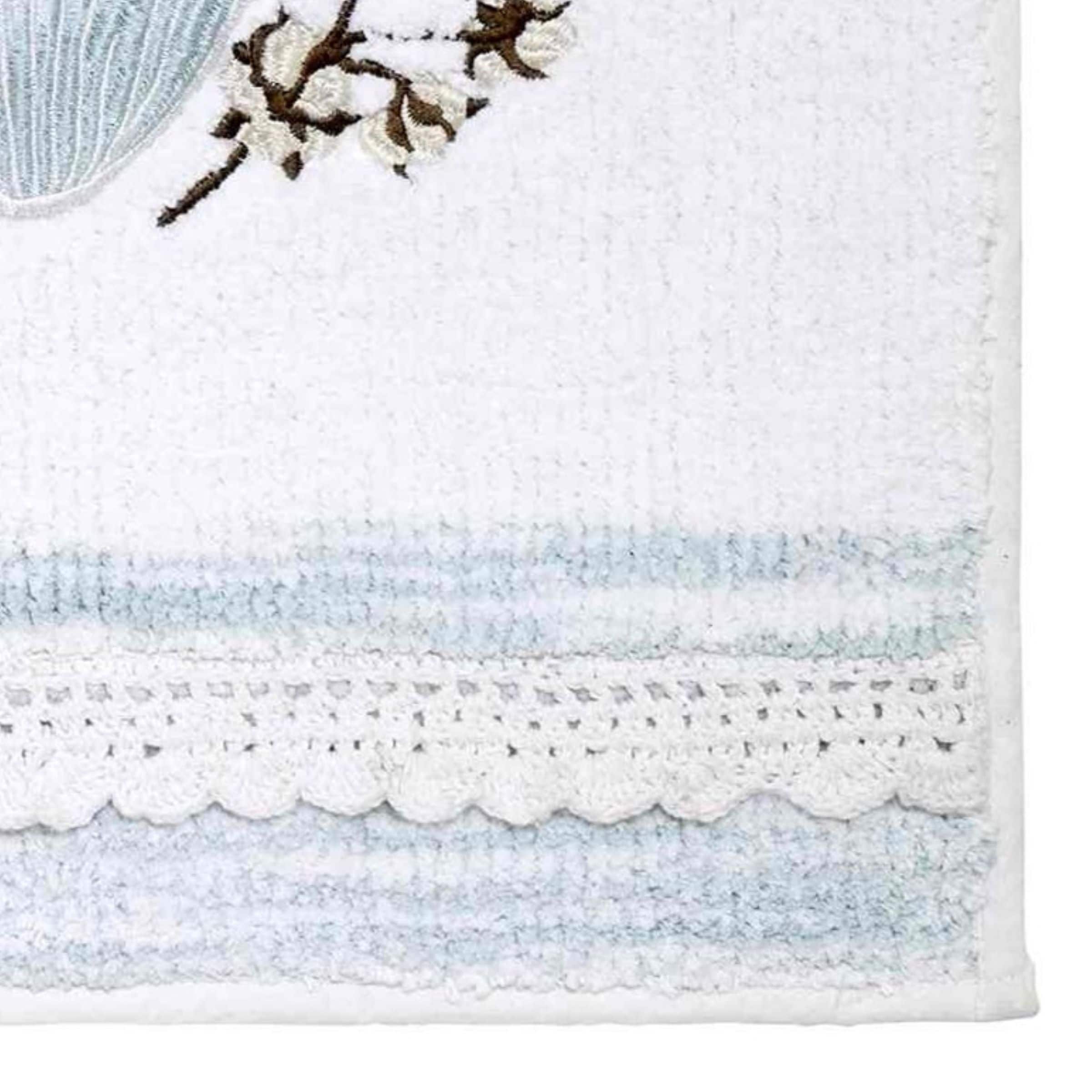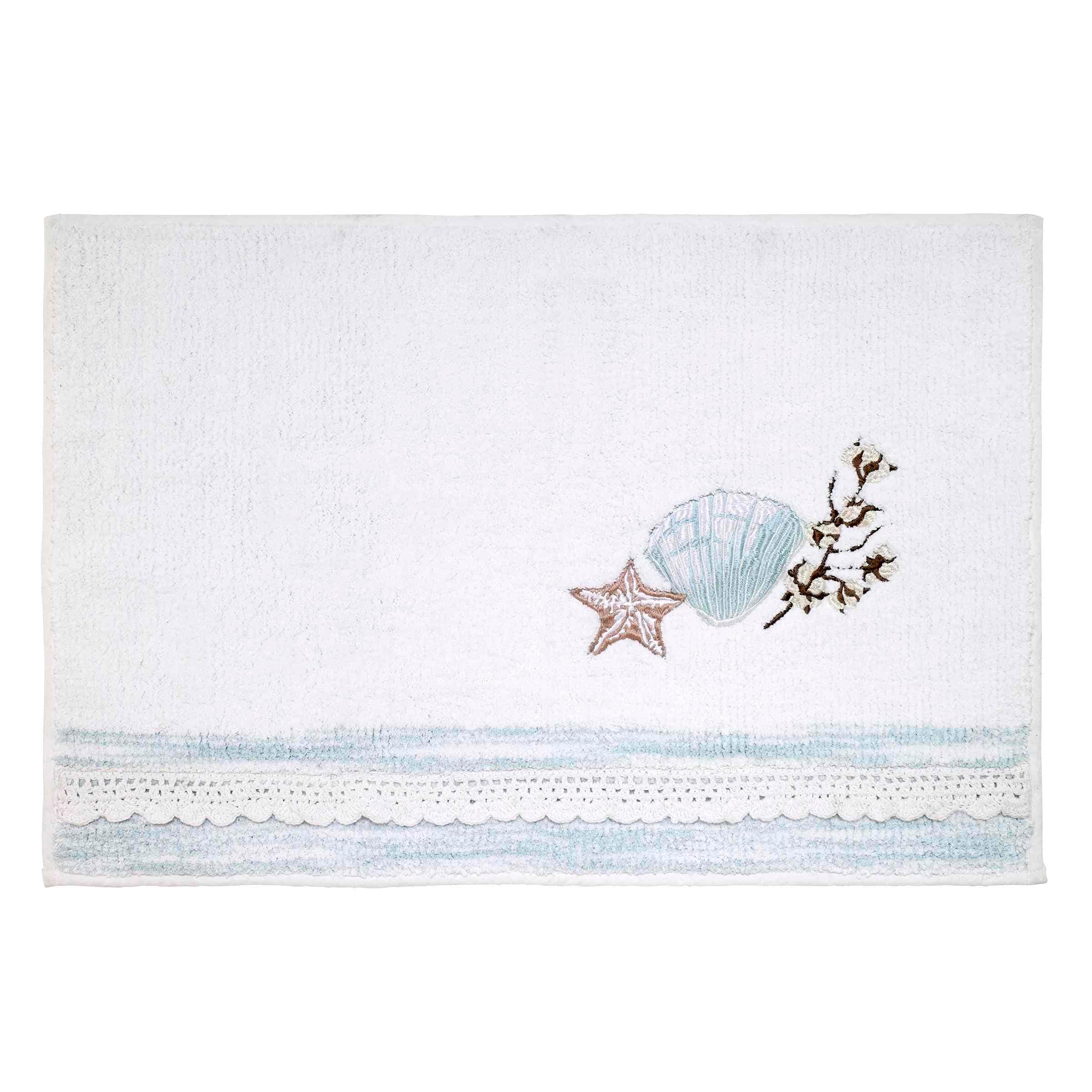 The Avanti Farmhouse Shell Rug features a beautifully embroidered fan shell with starfish and cotton on the vine on a 100% cotton white tufted ground. The rug is bordered with an aqua bottom edge with an attached lace trim. 20" x 30" with non-skid, latex back.