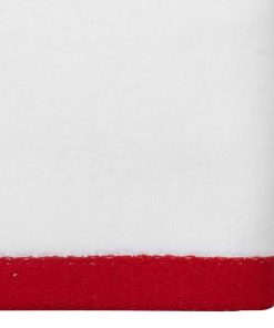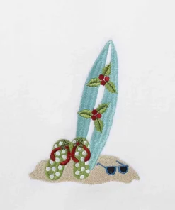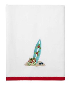 The Avanti Flamingo Jingle Decorative Bath Towel features an embroidered blue surfboard with holly, green and white polka dot flip flops and sunglasses on sand. The white 100% cotton velour towel is finished with a coordinating red polyester border. 27" x 50", machine washable.