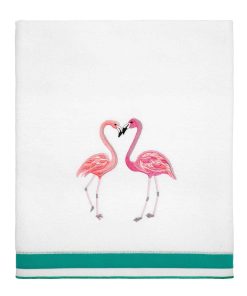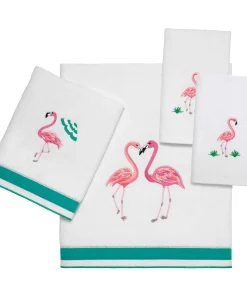 The Avanti Flamingo Paradise 4-Piece Towel Set features embroidered standing pink flamingos on a white velour ground. The towels are 100% cotton and bath and hand have a coordinating fabric trim. Set includes 1 bath towel (27" x 50") , 1 hand towel (16" x 30") and 2 fingertip towels (11" x 18").