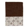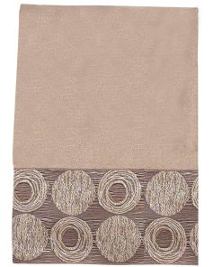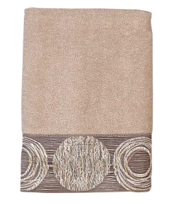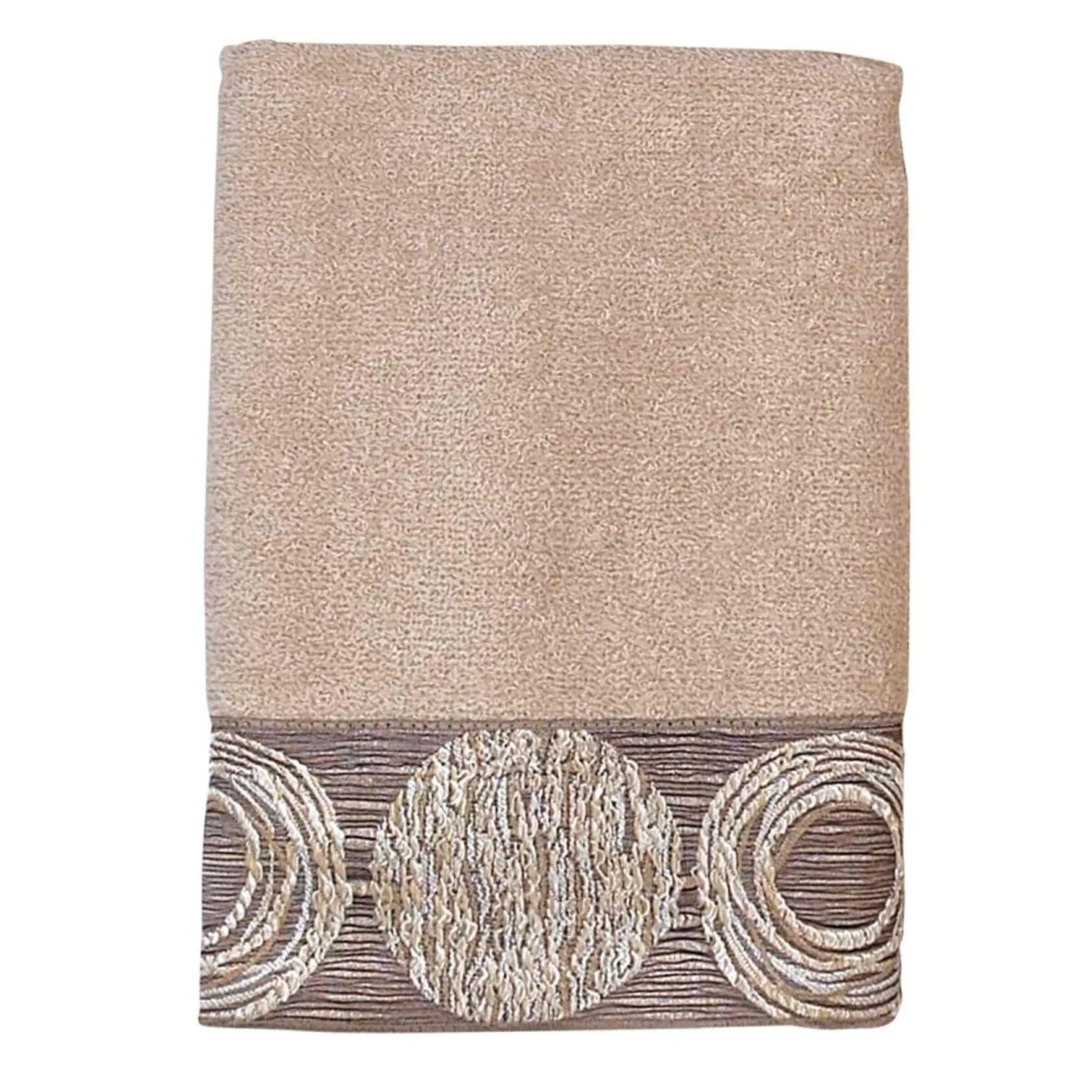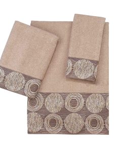 The Avanti Galaxy Linen 3-Piece Decorative Towel Set features a contemporary jacquard woven metallic border design with irregular circles in shades of ivory and brown. 100% cotton linen velour towel. Set includes one each bath (27" x 50"), hand (16" x 30"), fingertip (11" x 18").