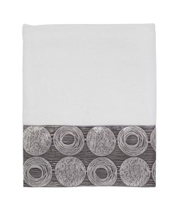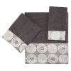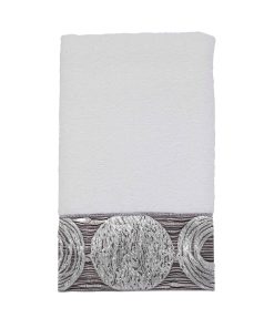 The Avanti Galaxy Mocha 3-Piece Decorative Towel Set features a contemporary jacquard woven metallic border design with irregular circles in shades of ivory and brown. 100% cotton mocha velour towel. Set includes one each bath (27" x 50"), hand (16" x 30"), fingertip (11" x 18").