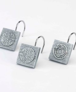 The Avanti Galaxy Silver 13-Pc Shower Curtain & Hook Set features a curtain with rows of irregular, textured grey circles on a shimmering silver cloth. The shower hooks mirror the fabric design in grey and silver hand painted resin. 100% polyester, 72" x 72" curtain, 12 resin hooks, 6 of each style.