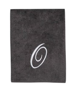 The Premier Granite/Silver Script Monogram Bath Towel features an embroidered silver script "O" on a dark grey ground. The 27" x 52" ringspun cotton terry granite towel is plush and absorbent and feels as great as it looks. Matching hand and fingertip sizes and other letters also available.