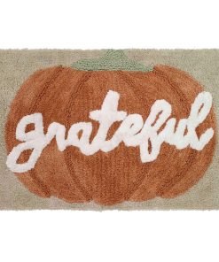 The Avanti Grateful Patch Decorative Bath Rug features a full-coverage orange pumpkin with green stem on an off-white ground and "Grateful" in white across the middle. Tufted of 100% polyester for soft-feel and easy care. Non-skid latex back, 20" x 30"