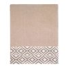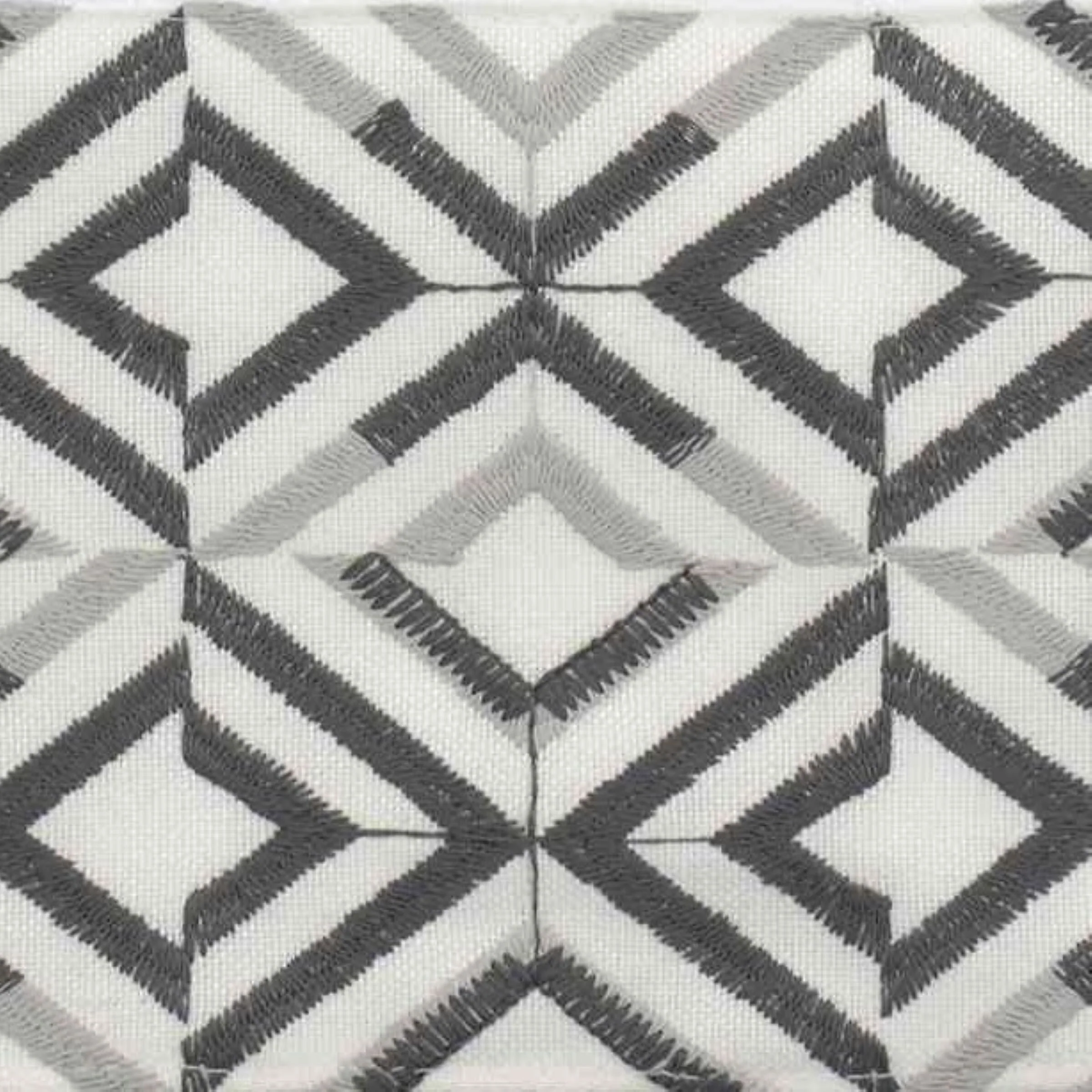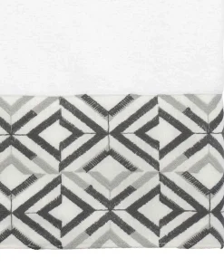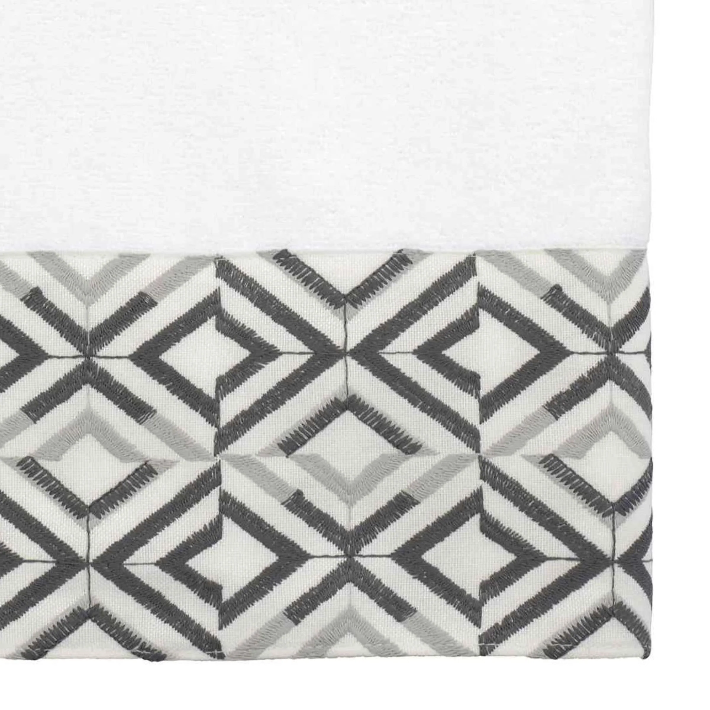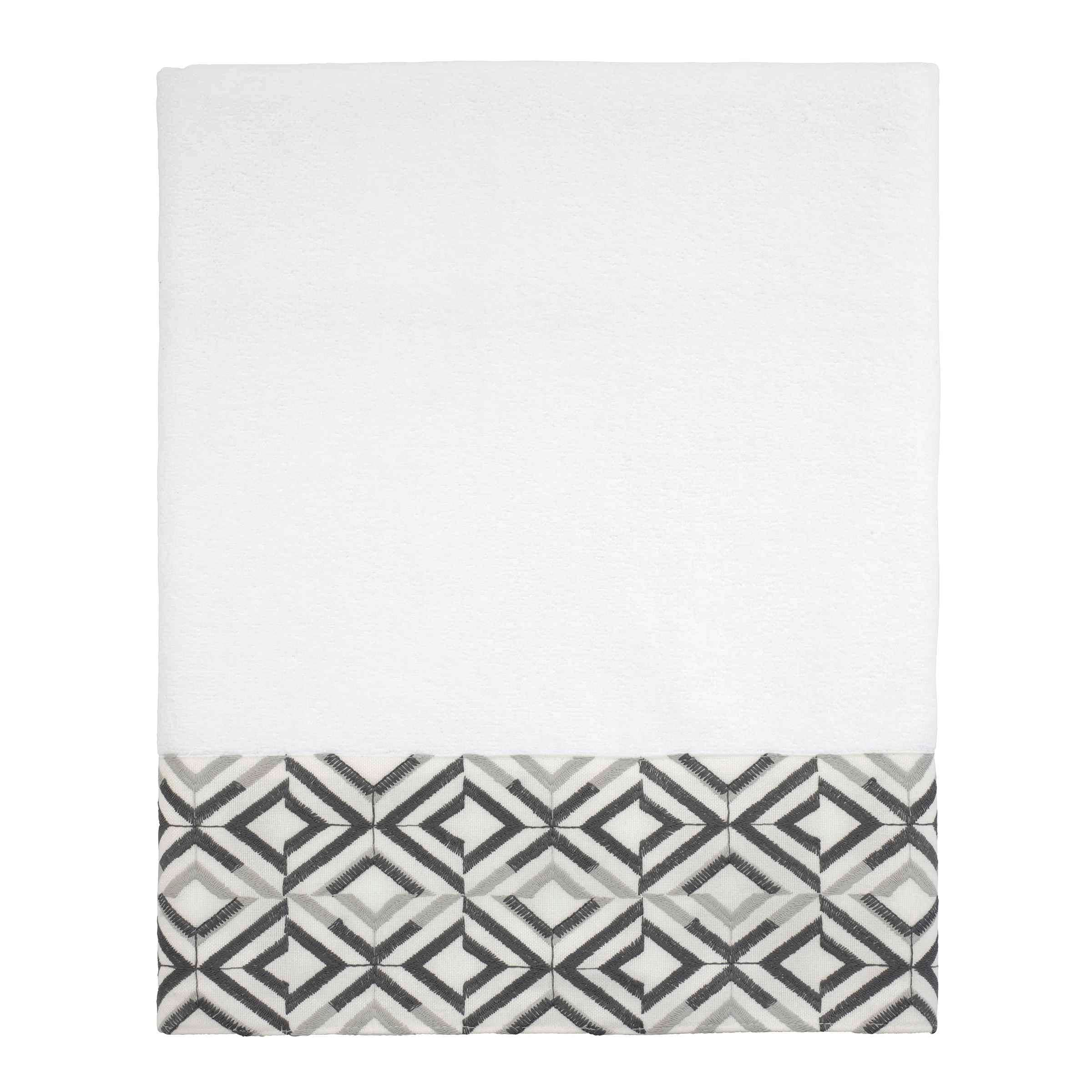 The Avanti Harlow White Bath Towel features offset rows of concentric diamonds intricately embroidered in light and dark grey on a 100% polyester white cloth. The 27" x 50" white velour towel is made of 100% cotton. Other colors and sizes available.