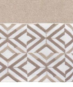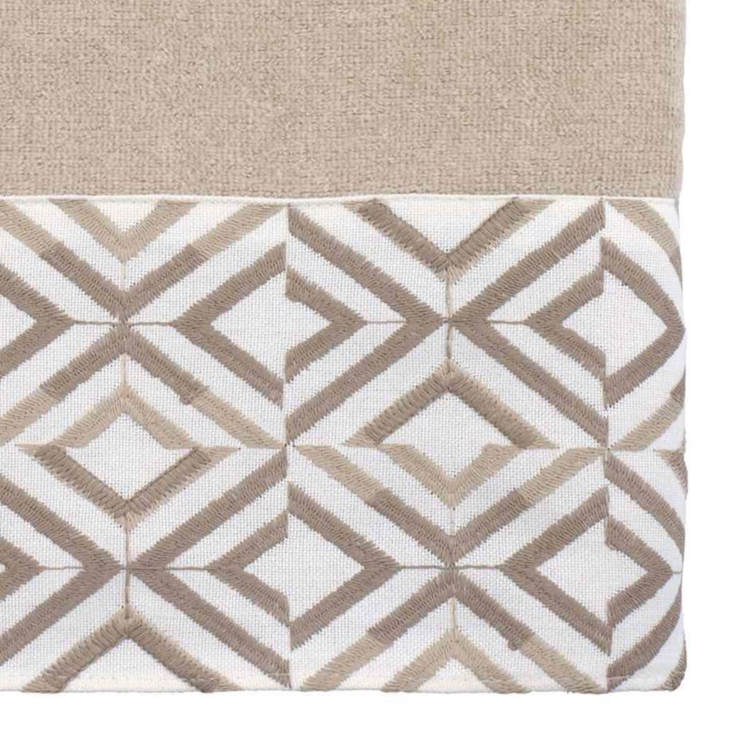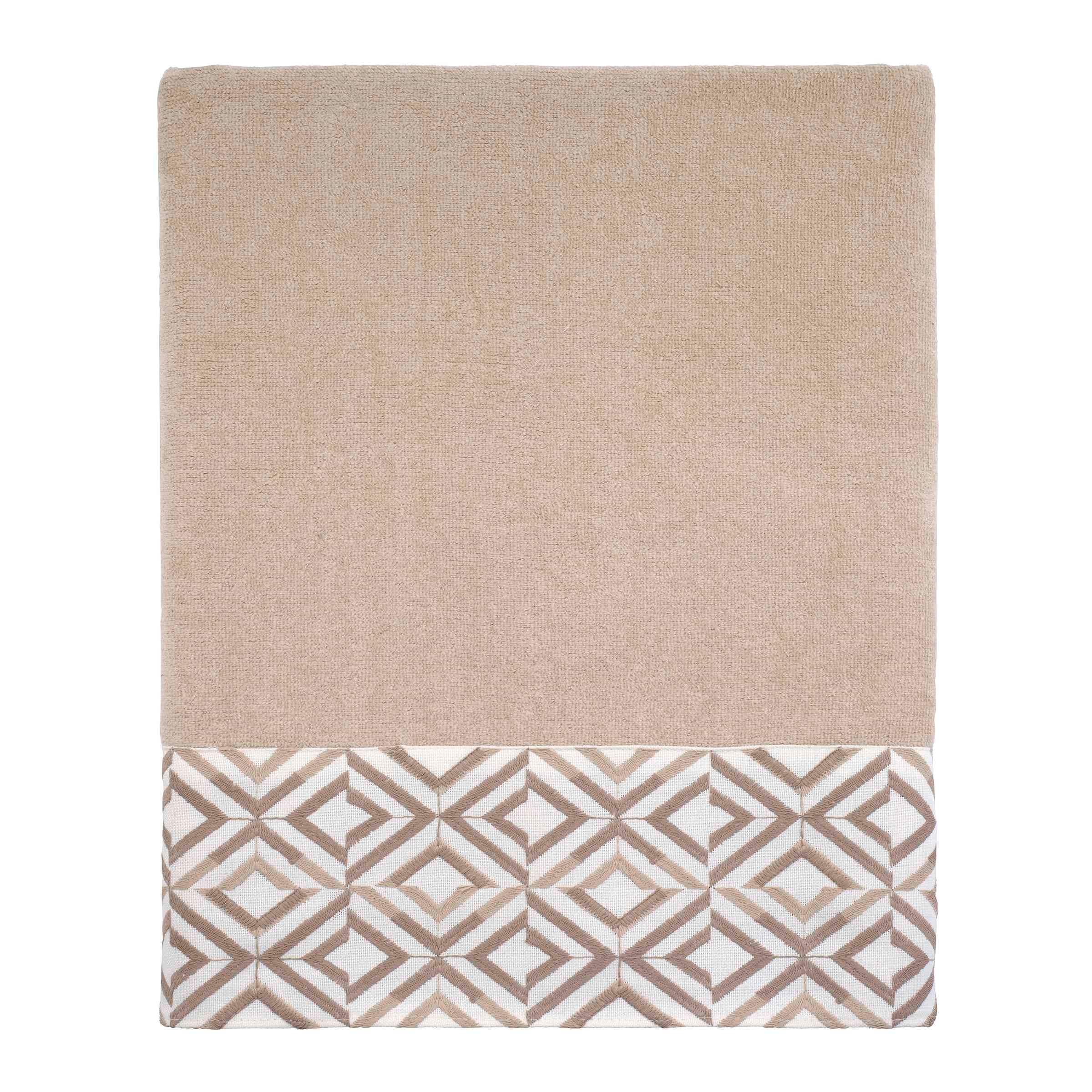 The Avanti Harlow Linen Bath Towel features offset rows of concentric diamonds intricately embroidered in light and medium brown on a 100% polyester ivory cloth. The 27" x 50" linen velour towel is made of 100% cotton. Other colors and sizes available.