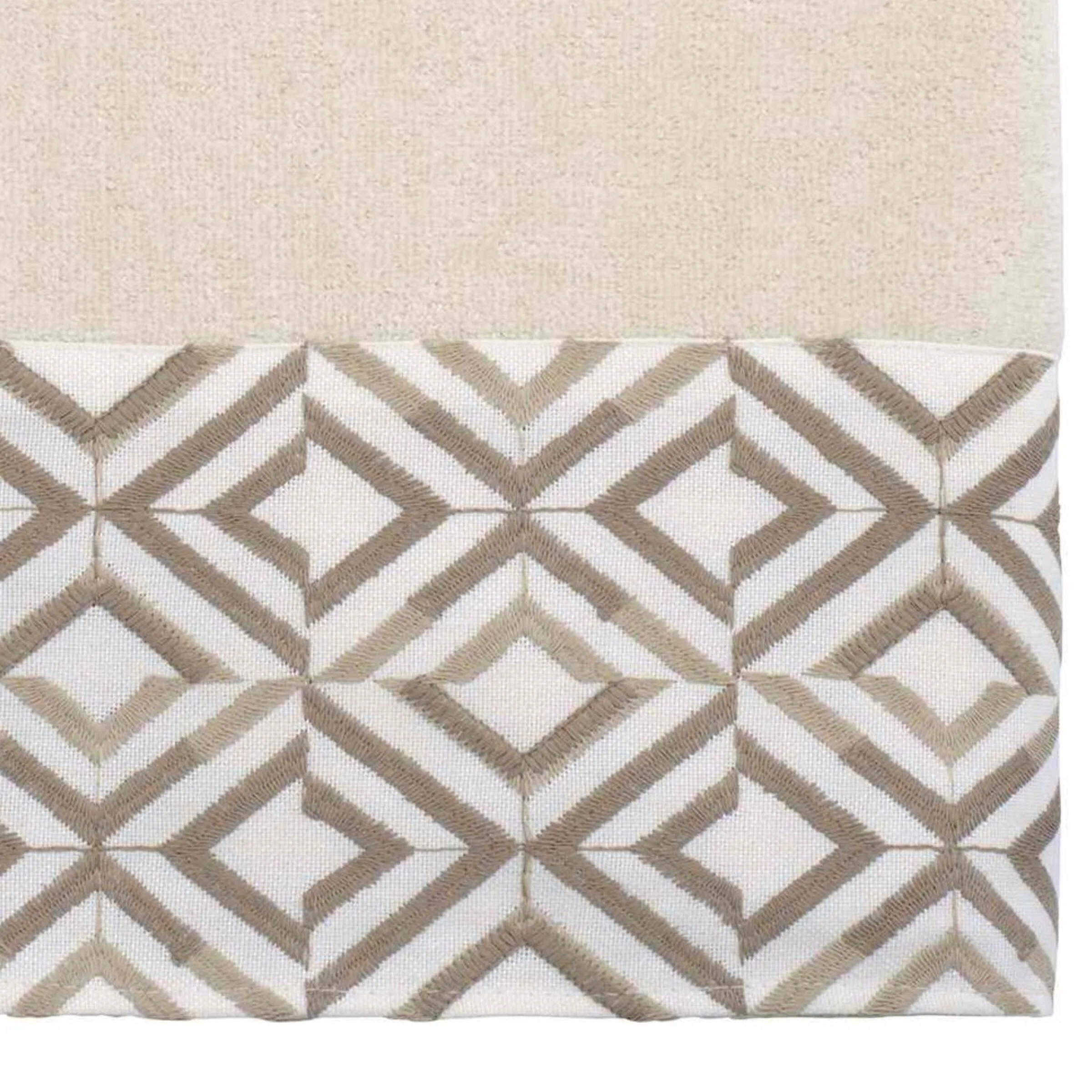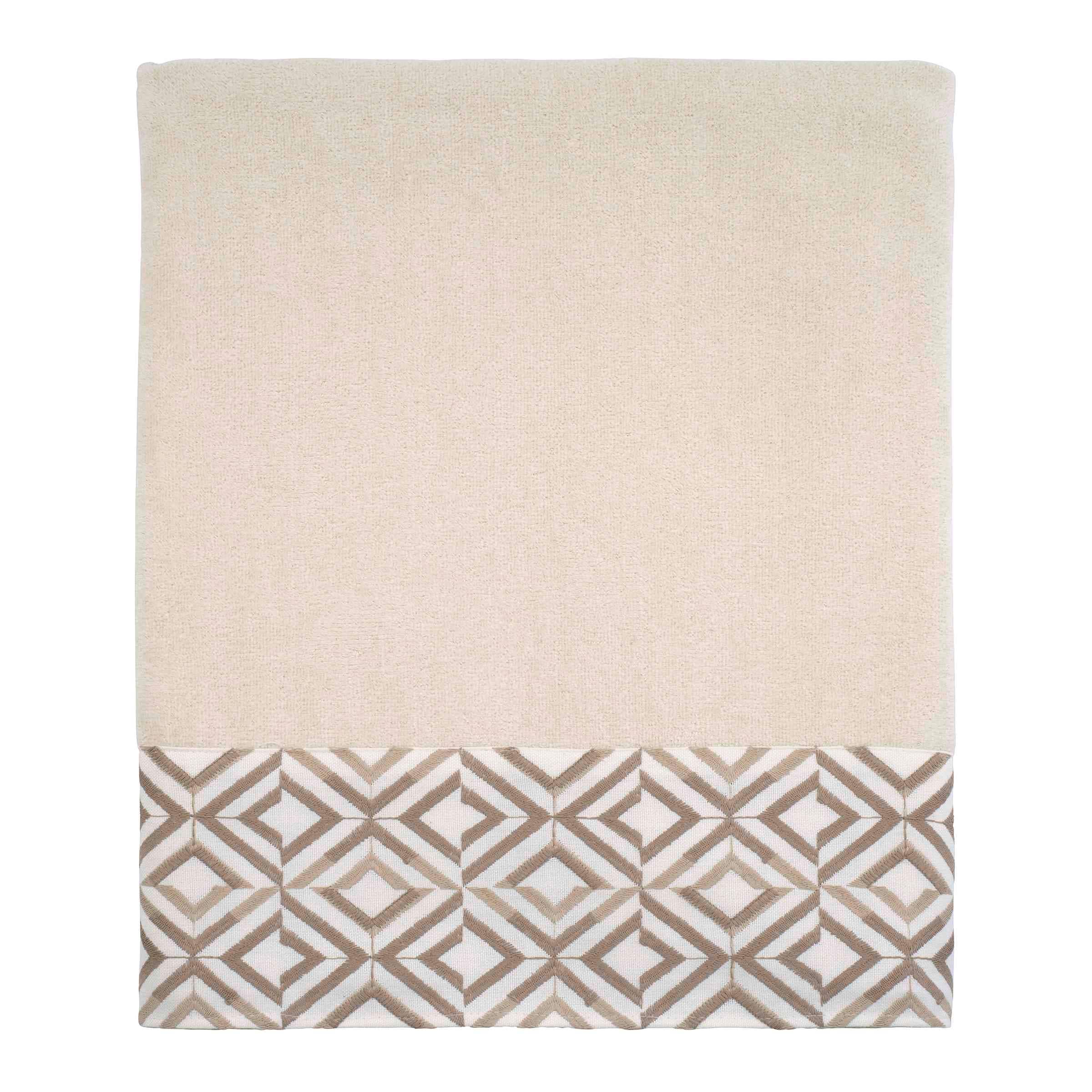 The Avanti Harlow Ivory Bath Towel features offset rows of concentric diamonds intricately embroidered in light and medium brown on a 100% polyester ivory cloth. The 27" x 50" ivory velour towel is made of 100% cotton. Other colors and sizes available.