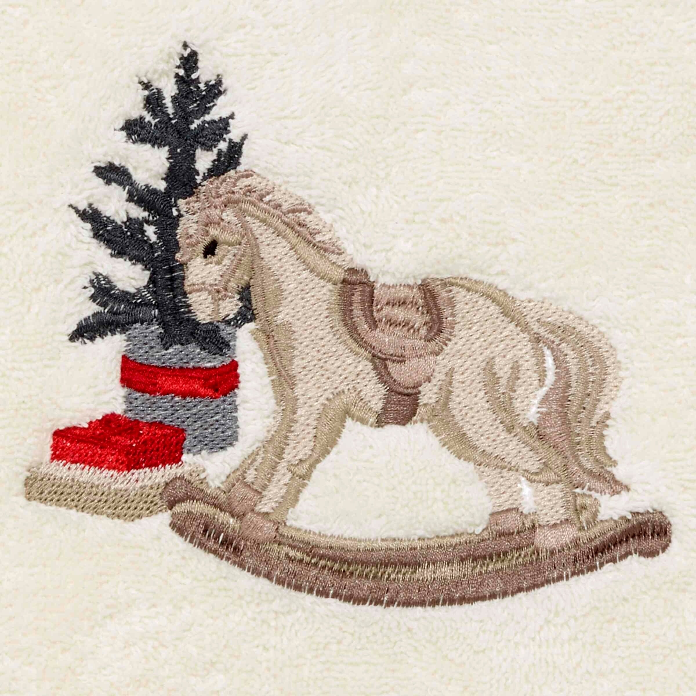 The Avanti Holiday Countdown 2-Pack Bath Towel Set features an embroidered rocking horse with presents and a Christmas tree, with a coordinating woven stitch-like red polyester border. The towels are 27" x 52" 100% cotton (excl of ornamentation) white terry. Coordinating pieces available.