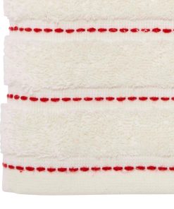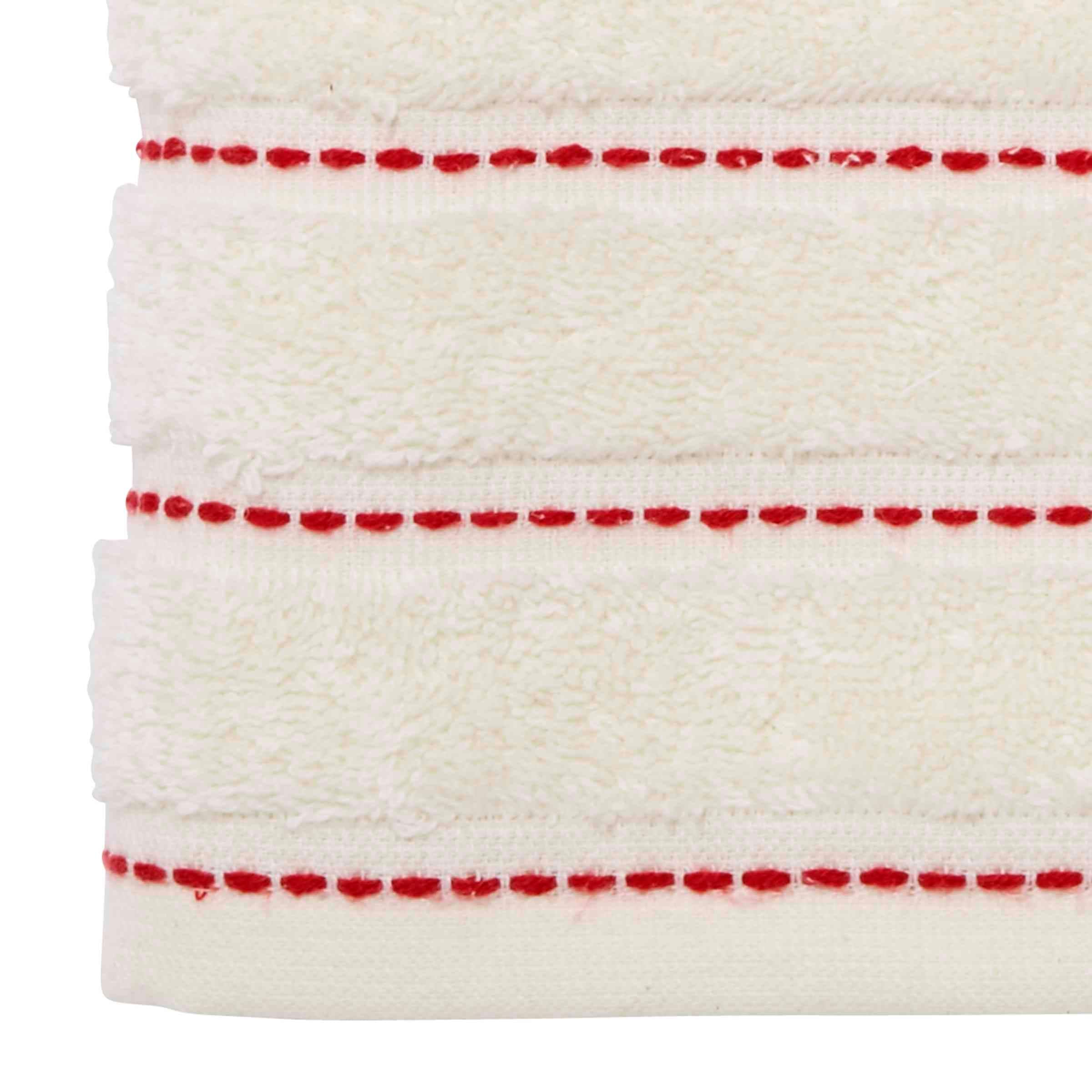 The Avanti Holiday Countdown Bath Towel features an embroidered rocking horse with presents and a Christmas tree, finished with a coordinating woven stitch-like red polyester border . The towel is 27" x 52" 100% cotton (exclusive of ornamentation) ivory terry. Other coordinating pieces available.
