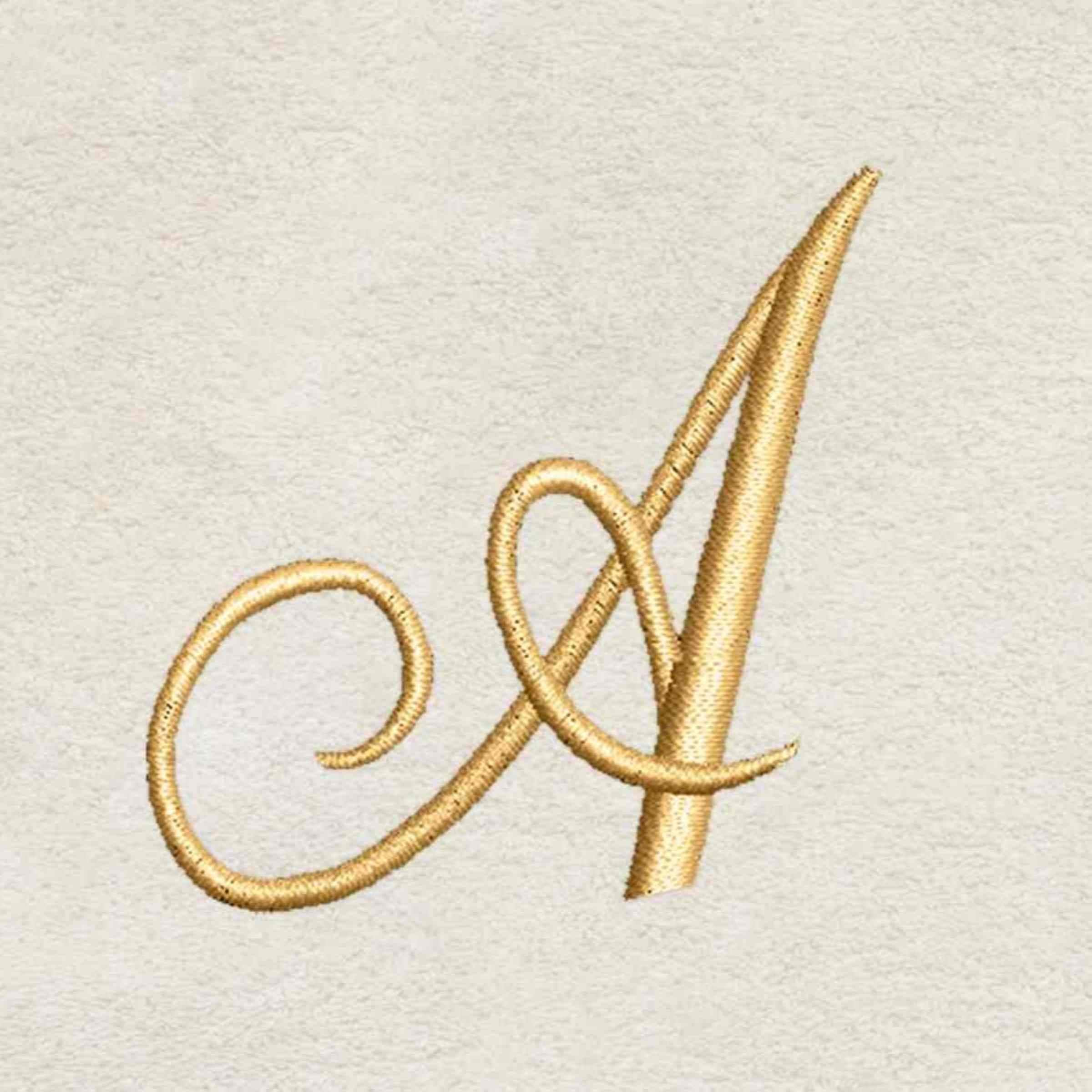 The Premier Ivory with Gold Script Monogram Fingertip Towel features an embroidered metallic gold script "A" on an ivory ground. The 11" x 18" ringspun cotton terry ivory towel is plush and absorbent and feels as great as it looks. Matching bath and hand sizes and other letters also available.