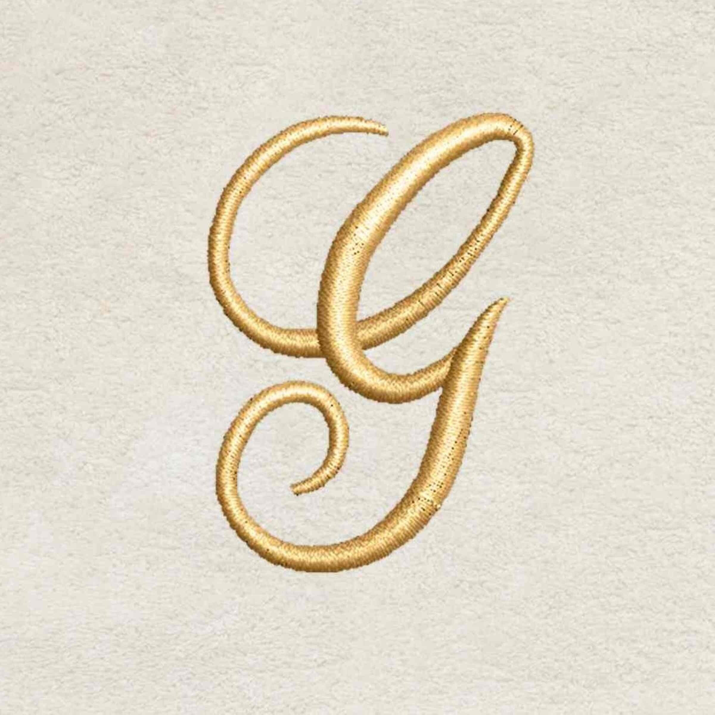 The Premier Ivory with Gold Script Monogram Fingertip Towel features an embroidered metallic gold script "G" on an ivory ground. The 11" x 18" ringspun cotton terry ivory towel is plush and absorbent and feels as great as it looks. Matching bath and hand sizes and other letters also available.