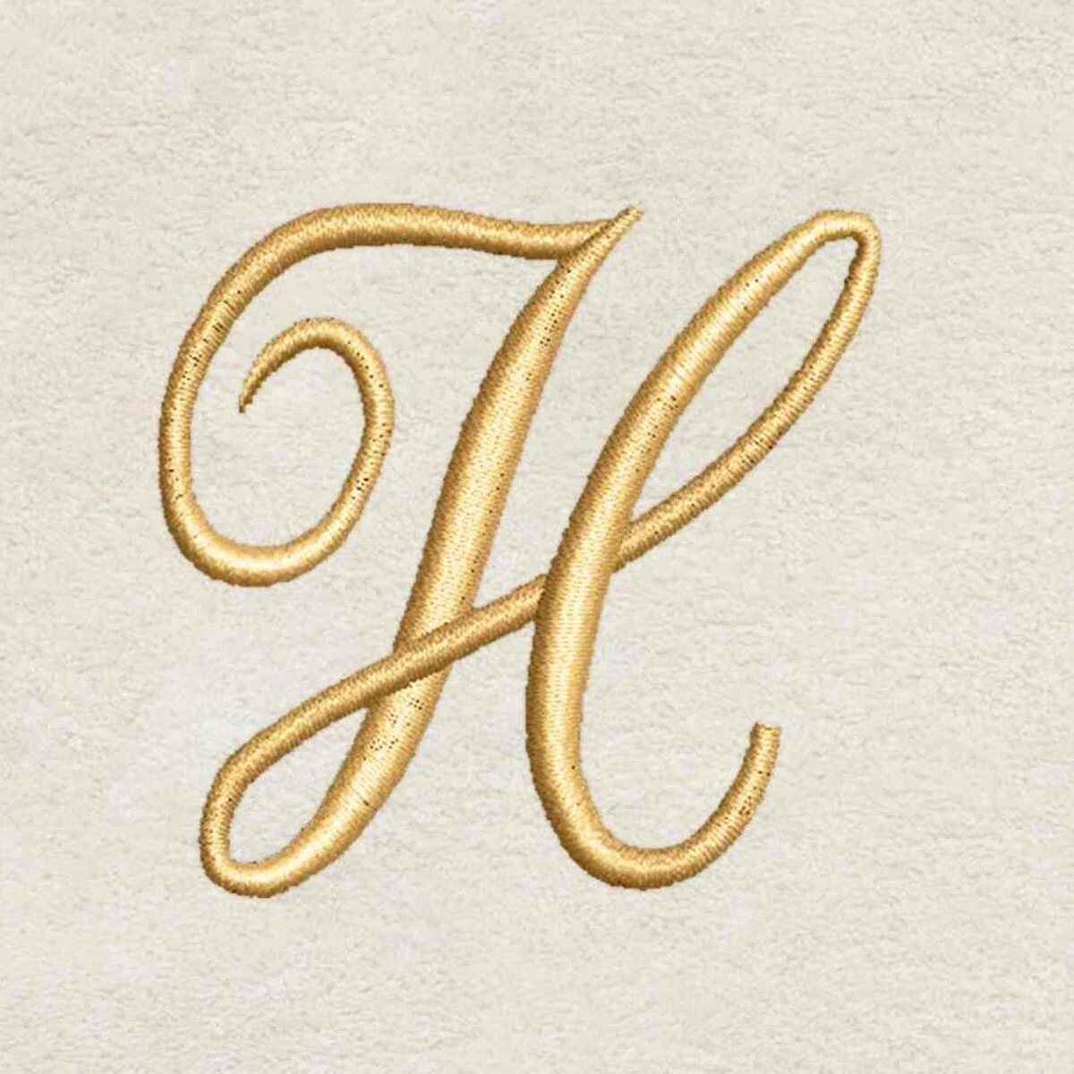 The Premier Ivory with Gold Script Monogram Fingertip Towel features an embroidered metallic gold script "H" on an ivory ground. The 11" x 18" ringspun cotton terry ivory towel is plush and absorbent and feels as great as it looks. Matching bath and hand sizes and other letters also available.