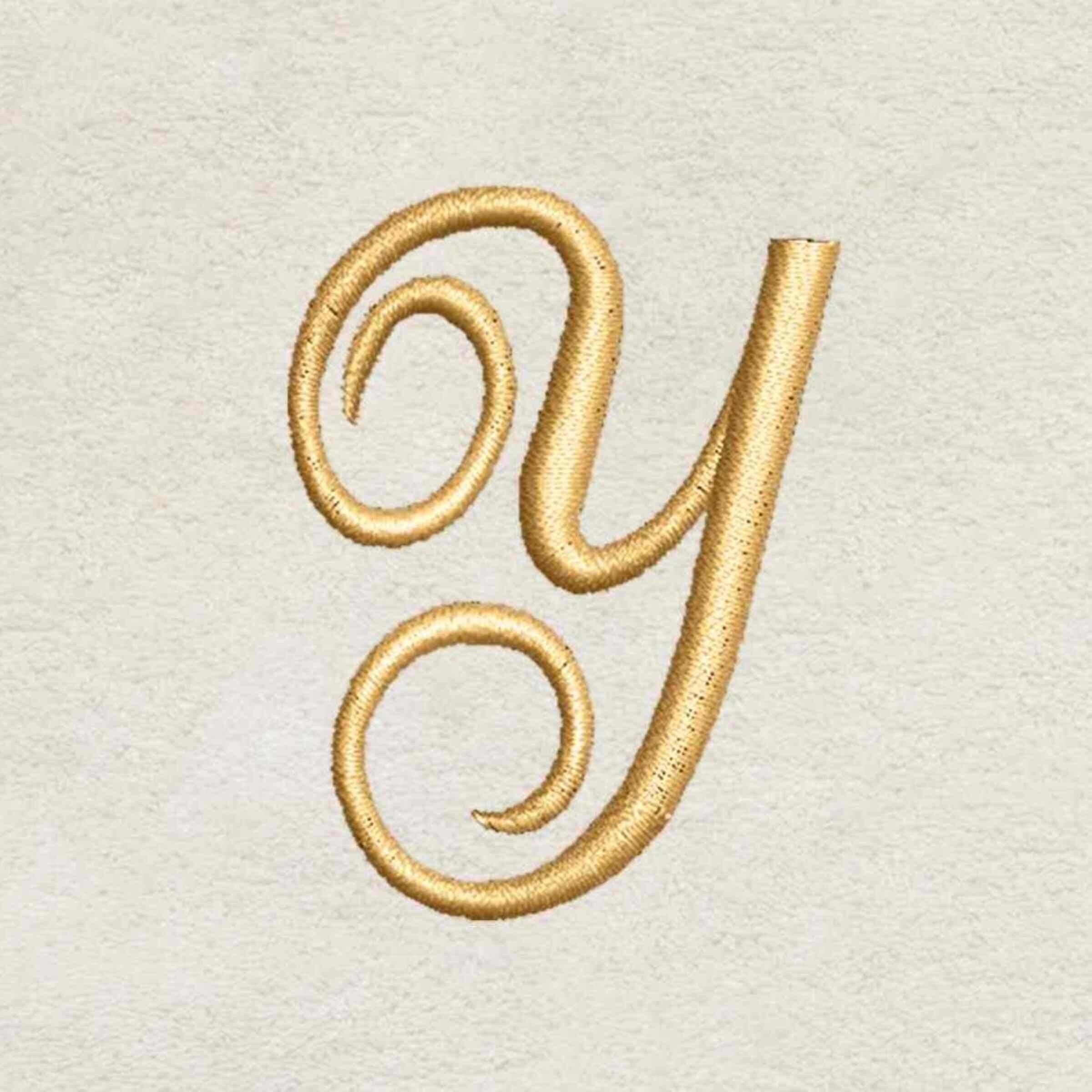 The Premier Ivory with Gold Script Monogram Fingertip Towel features an embroidered metallic gold script "Y" on an ivory ground. The 11" x 18" ringspun cotton terry ivory towel is plush and absorbent and feels as great as it looks. Matching bath and hand sizes and other letters also available.