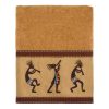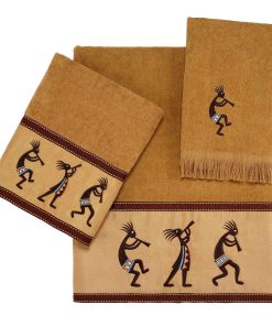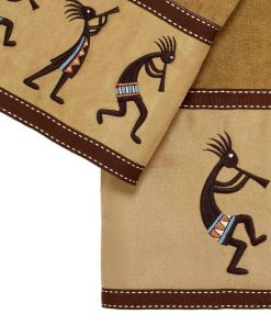 The Avanti Kokopelli Nutmeg 3-Pc Towel Set features embroidered Kokopellis playing their flutes on a gold suede band with contrasting brown ribbon on the bath and hand sizes. 100% cotton nutmeg velour towel. Set Includes bath (27" x 50"), hand (16" x 30")and fingertip (11" x 18") towel.