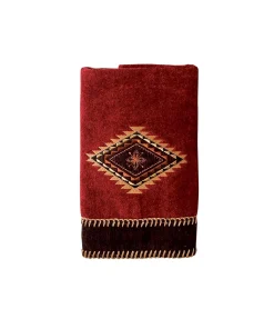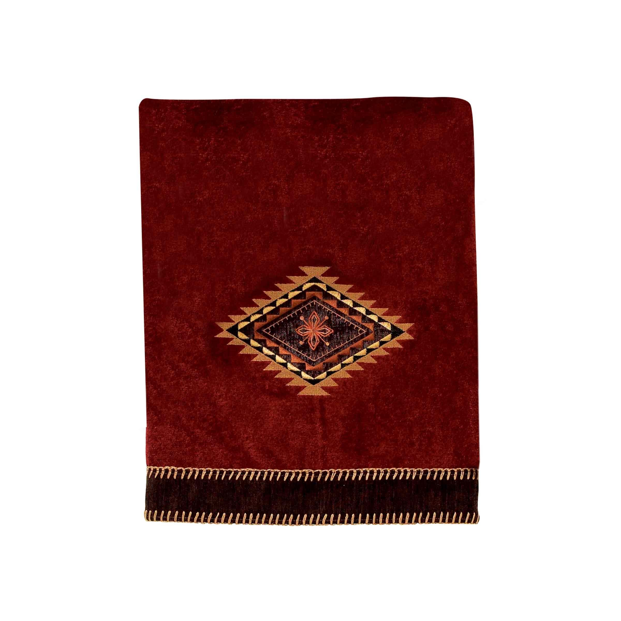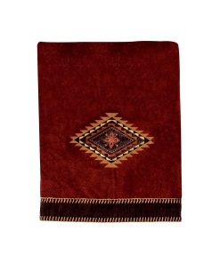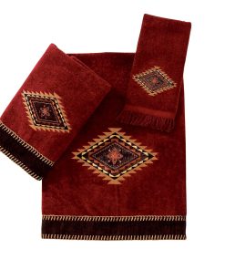 The Avanti Mojave Brick 3-Pc Decorative Towel Set features an embroidered Aztec motif in copper, gold and brown and coordinating whip-stitched suede fabric border on bath and hand sizes. 100% cotton brick red velour towel. Includes bath (27" x 50"), hand (16" x 30"), fingertip (11" x 18") towel.