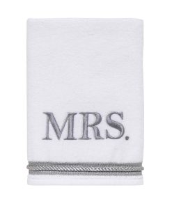 The Avanti Mrs. White 3-Piece Decorative Towel Set features "Mrs." embroidered in silver block letters with a silver rope trim on a 100% cotton white velour towel. Includes one bath (27" x 50"), hand (16" x 30") and fingertip (11" x 18") towel. Mr. is also available and waiting (for Mrs. Right).