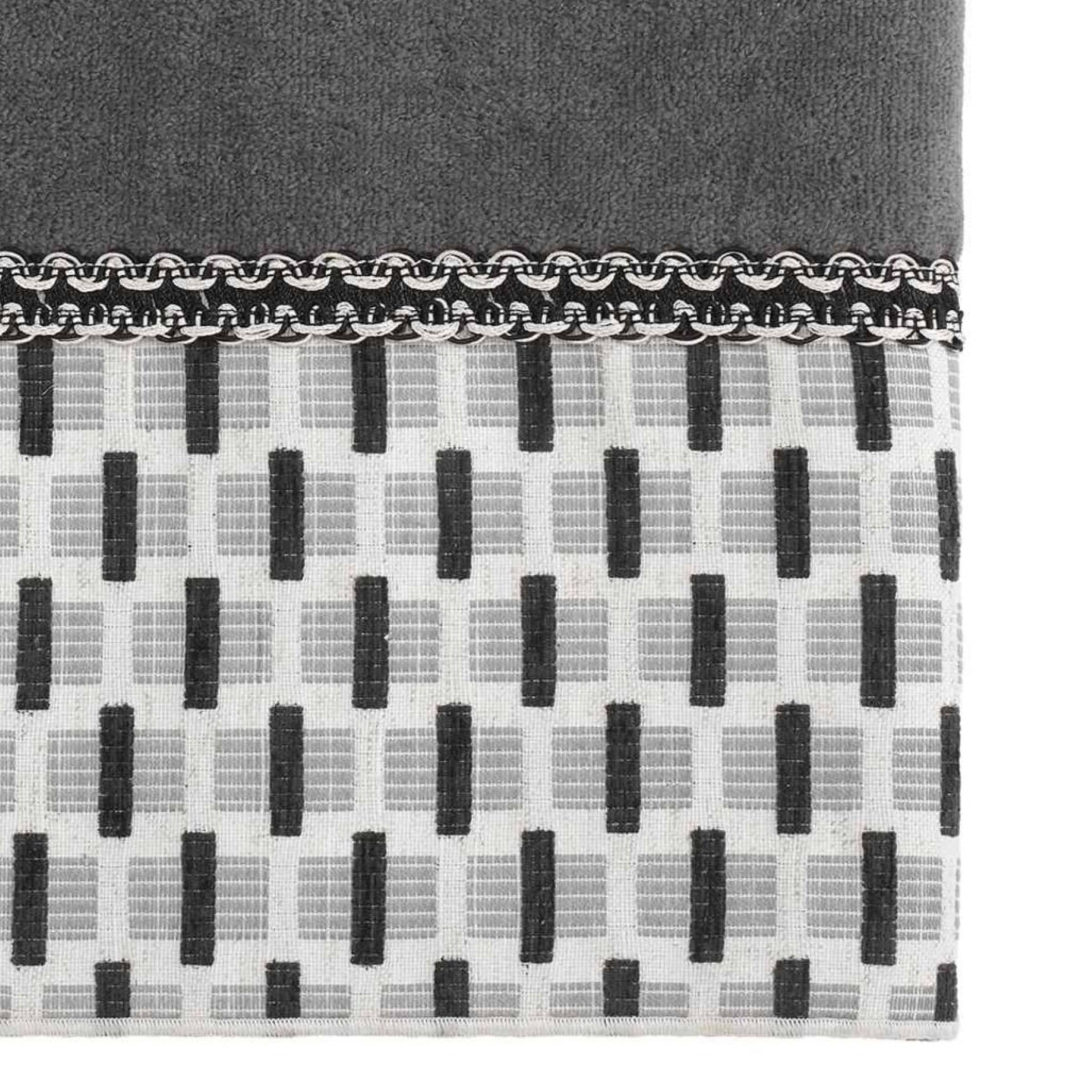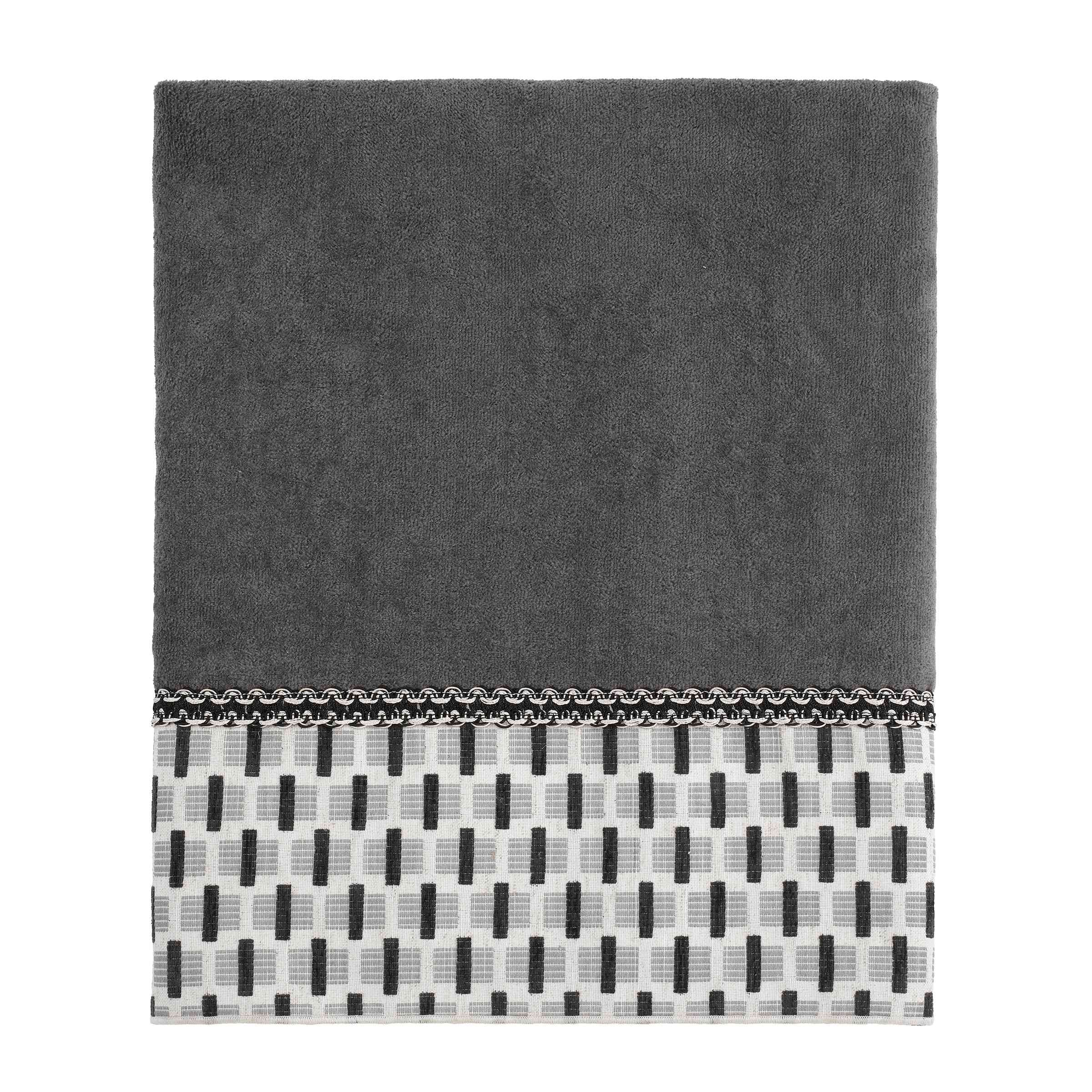 The Avanti Norwood Granite Bath Towel features a black, silver and ivory textured woven contemporary geometric fabric border. A coordinating black and ivory flat braid is attached at the top edge. The 27" x 50" 100% cotton granite towel is sheared for a silky, smooth finish.