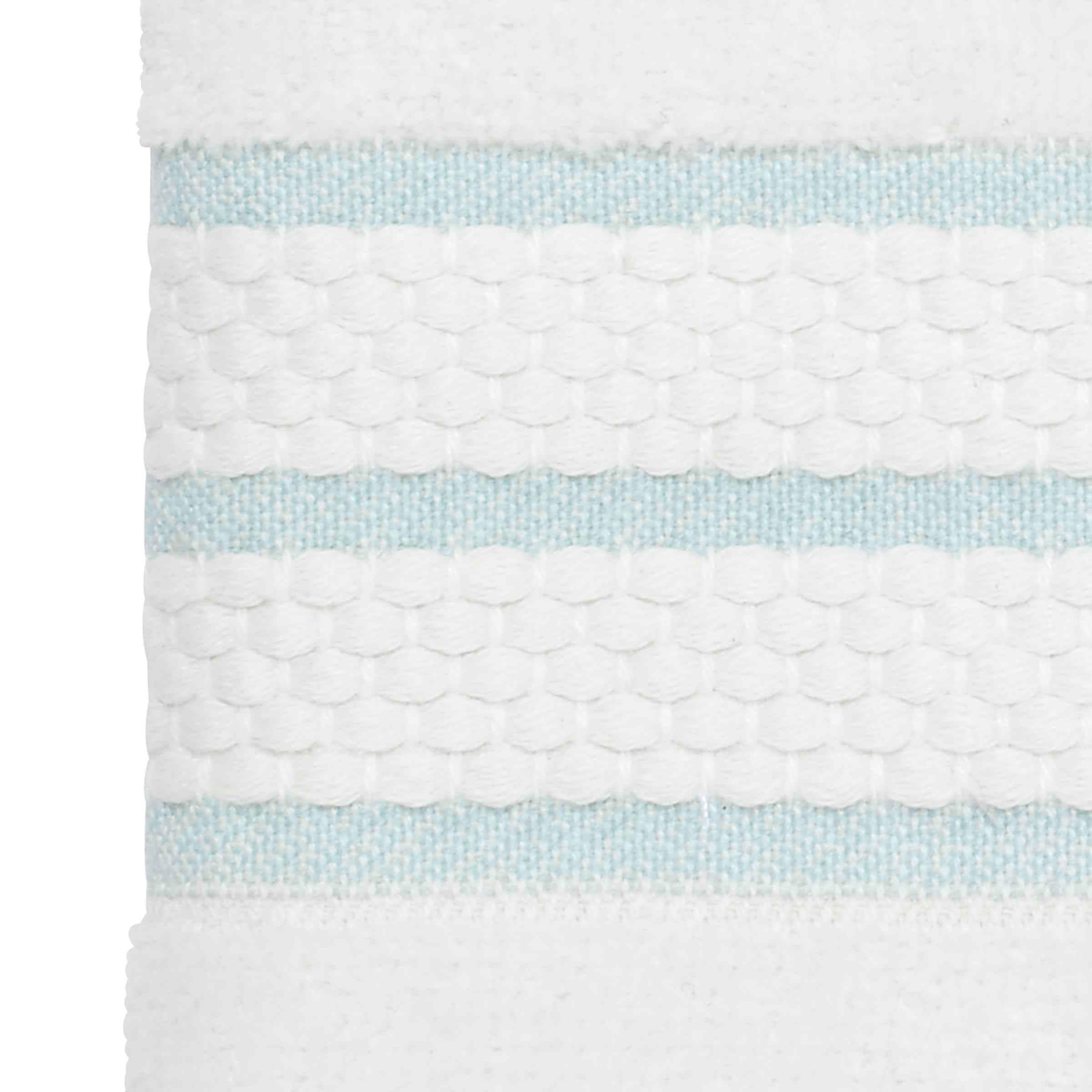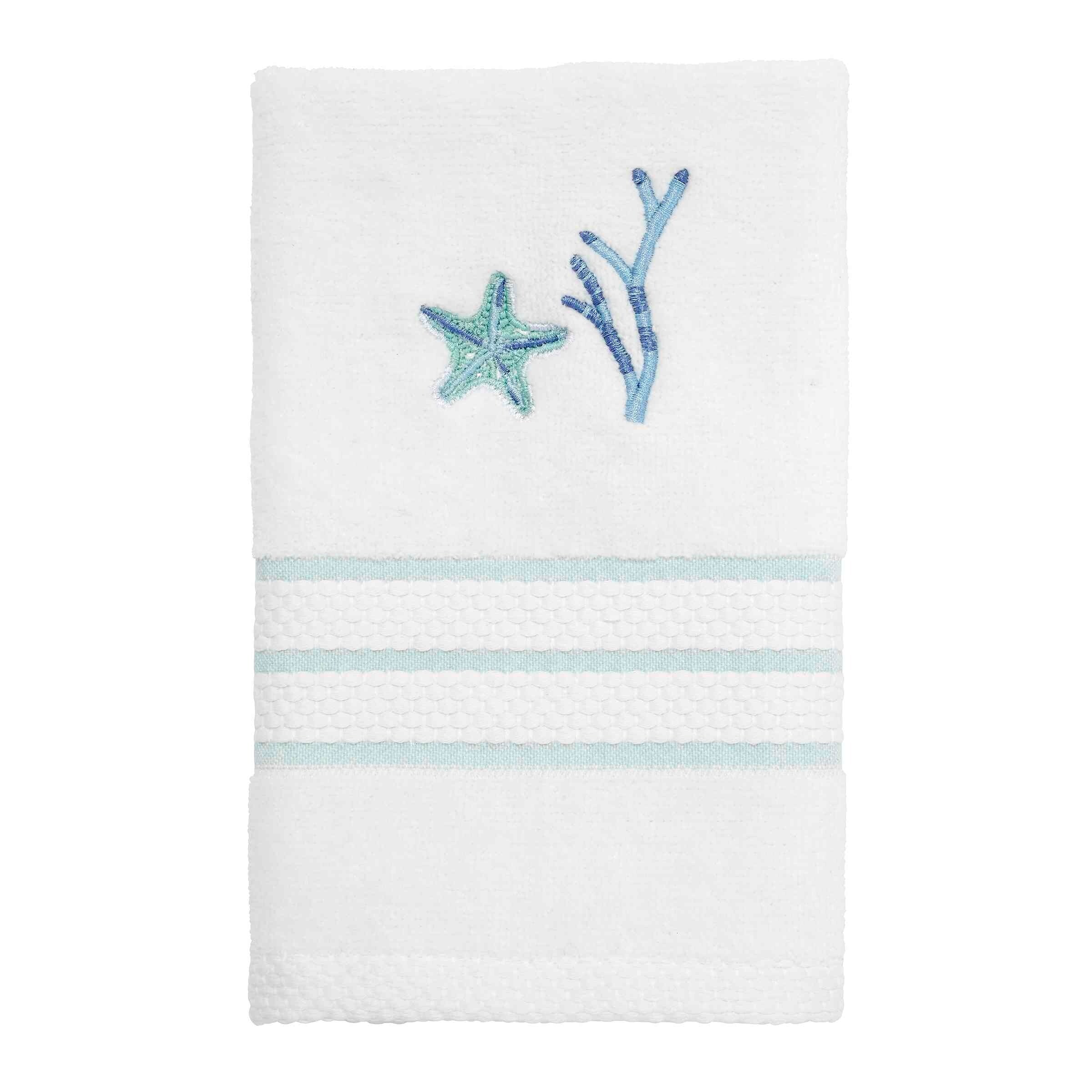 The Avanti Ocean Friends Decorative Embroidered Fingertip Towel features a blue coral and starfish in intricate detail. The 11" x 18" 100% cotton white terry towel is finished with coordinating blue polyester stripes. Bath and hand sizes also available.