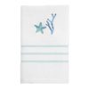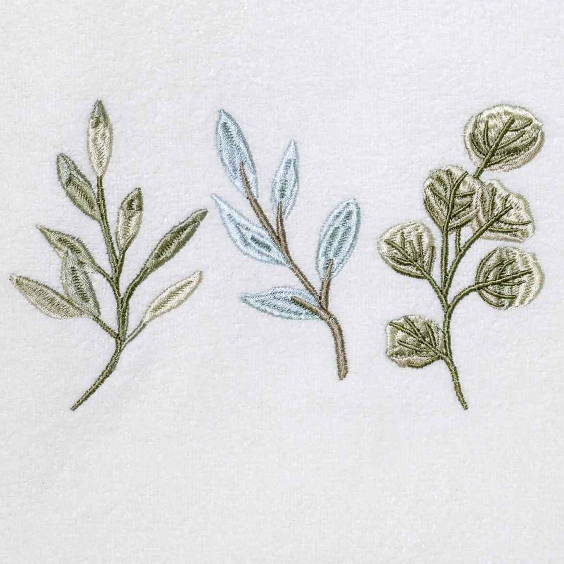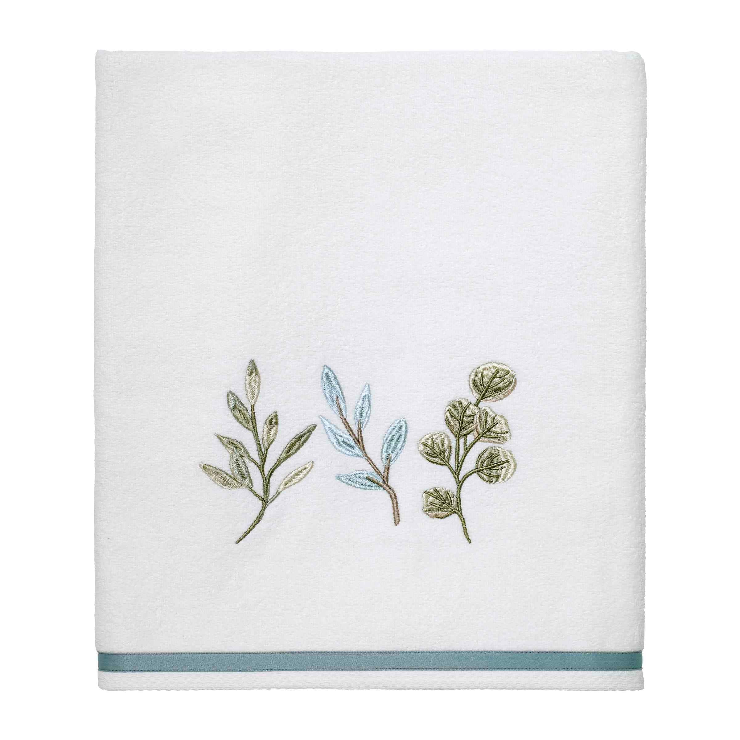 The Avanti Ombre Leaves Decorative Bath Towel features three beautifully embroidered branches with leaves in shades of green, blue and beige on a 100% cotton velour towel. The 27" x 50" towel is finished with a blue fabric border. Coordinating shower curtain, rug, accessories and towels available.