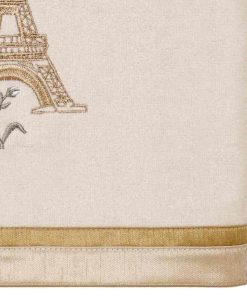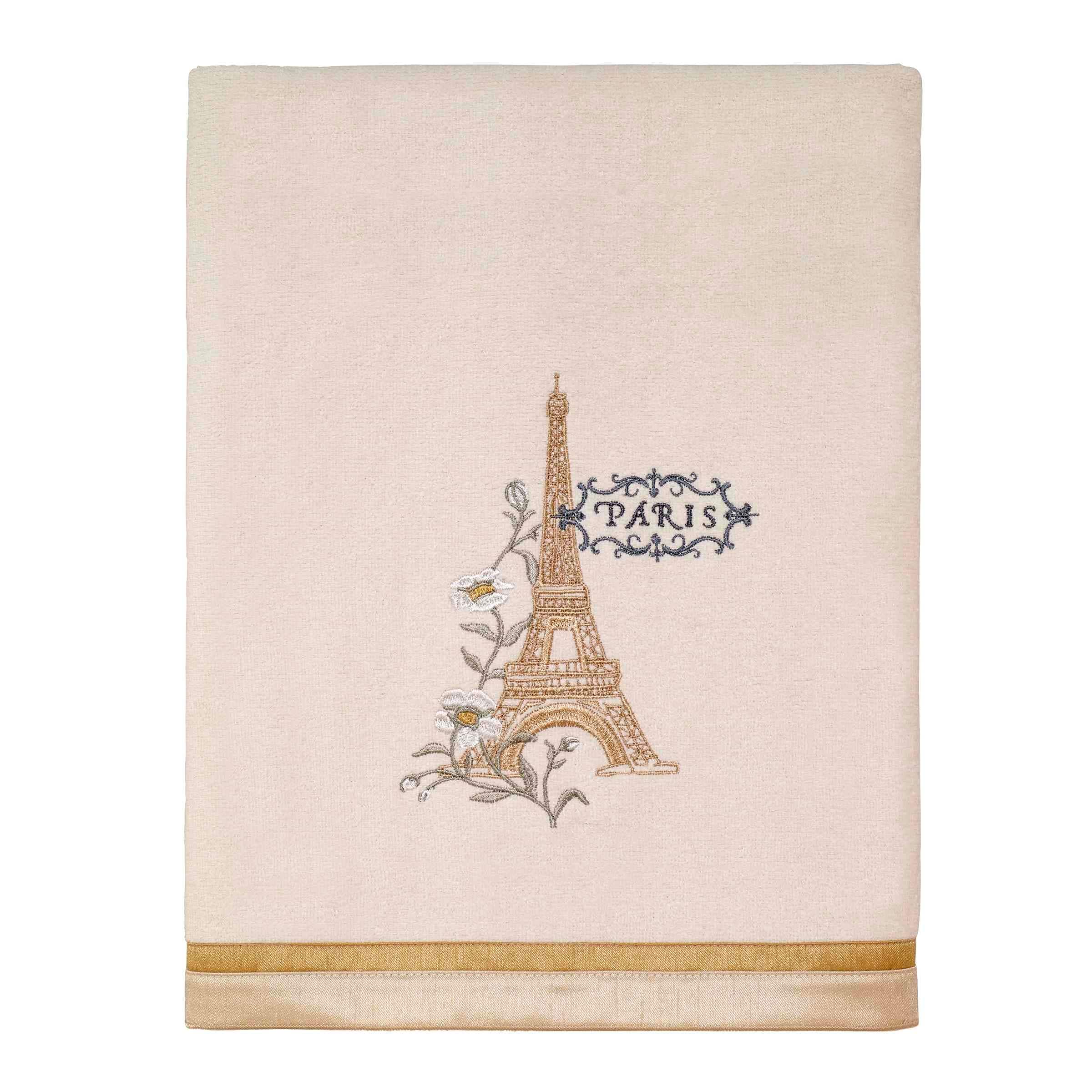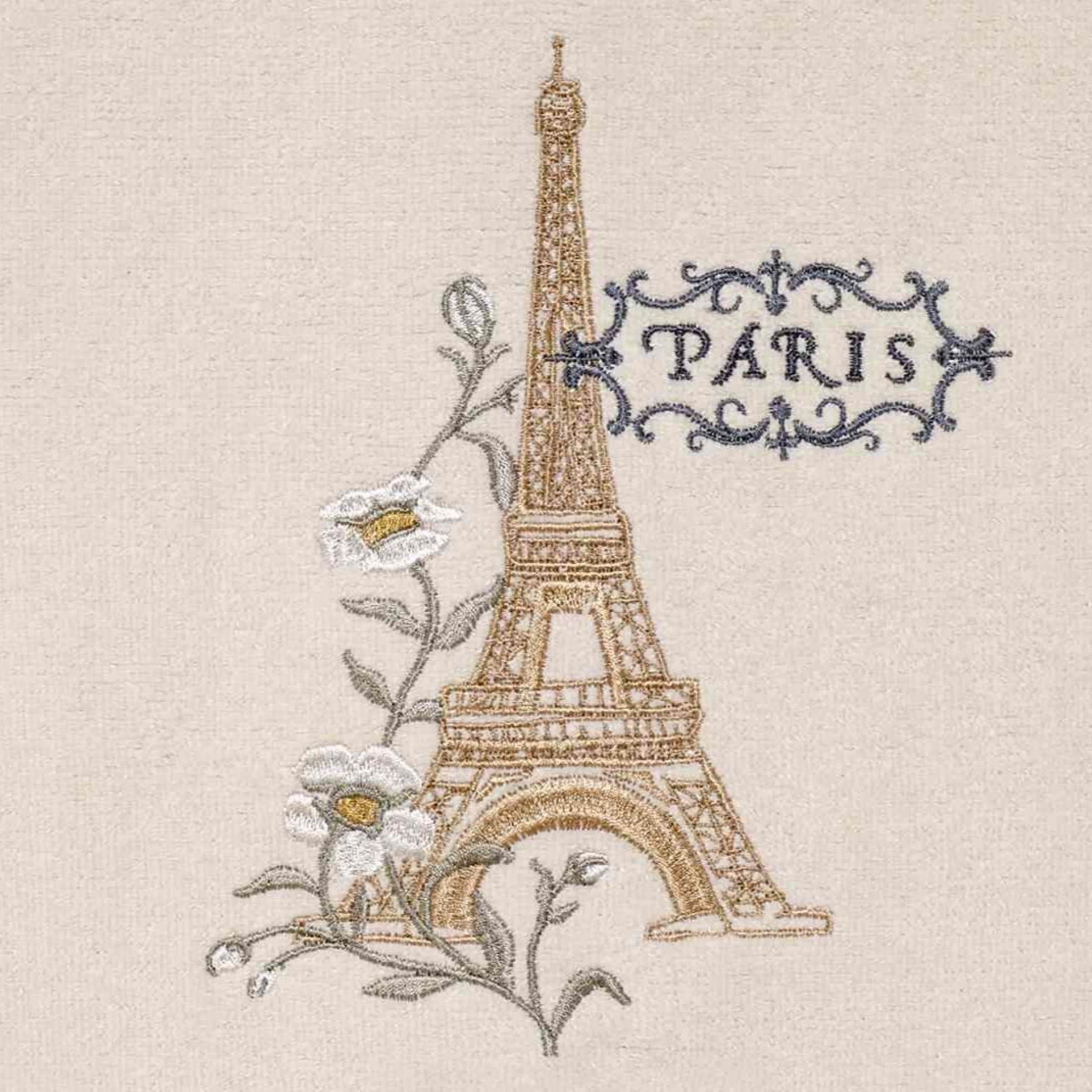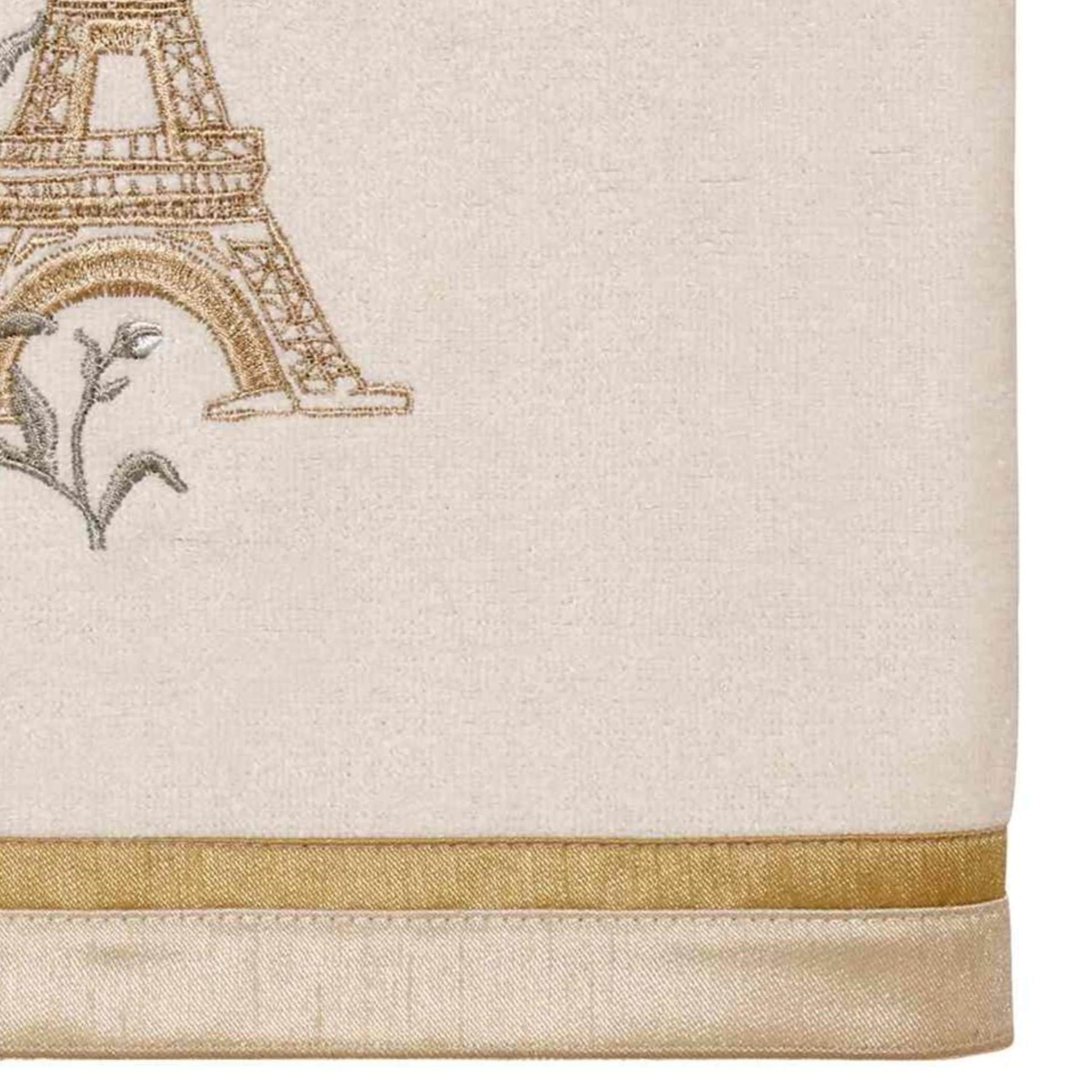 The Avanti Paris Botanique Bath Towel features an embroidered gold Eiffel Tower surrounded by grey "Paris" and yellow and white flowers. 27" x 50" 100% cotton ivory velour towel, finished with a two-tone bold and beige coordinating fabric border. Accessories, rug and shower curtain available.