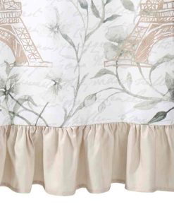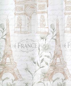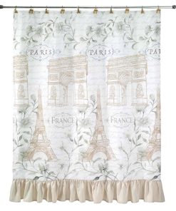 The Avanti Paris Botanique Shower Curtain is printed with the Eiffel Tower and Arc de Triomphe in gold and "Paris" and "France" and vines, flowers and words in a grey background on an ivory ground. The shower curtain is finished with a coordinating ruffle at the bottom. 72" x 72", polyester.