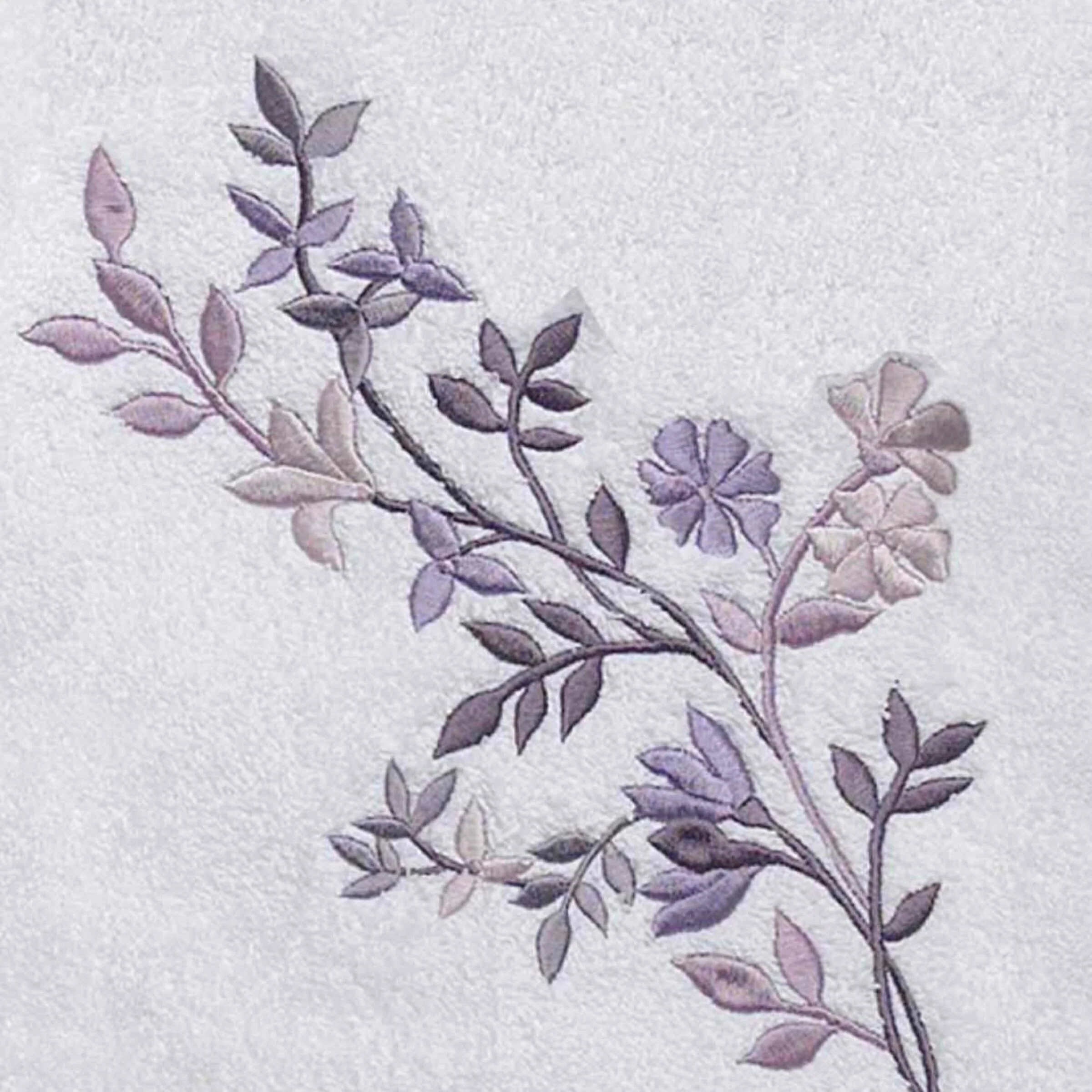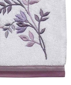 The Avanti Whisper Decorative Bath Towel features an off-center branch with leaves and flowers embroidered in shades of purple, lilac and plum. Towel is finished with a two-tone purple fabric border. Plush and absorbent 27" x 52" white terry towel is 100% cotton. Hand and fingertip also available.